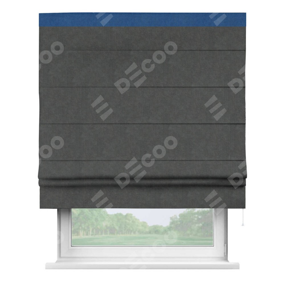 Римская штора производителя «Cortin», используется для проёма, пошита из ткани вельвет тёмно-серый, артикул ткани 33811. Отделка шторы кантом «Кинг», ткань для канта используется из вельвета разной расцветки на выбор. Имеет универсальный механизм и подходит для монтажа: на потолок, на стену и в нишу.
