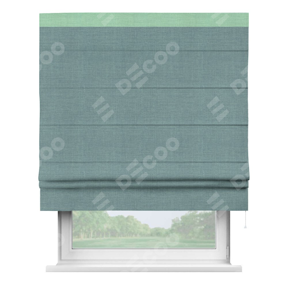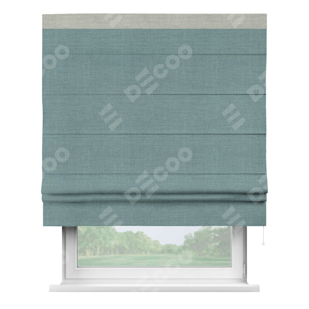 Римская штора производителя «Cortin», используется для проёма, пошита из ткани лён голубой, артикул 74 736. Отделка шторы кантом «Кинг», ткань для канта используется из льна разной расцветки на выбор. Имеет универсальный механизм и подходит для монтажа: на потолок, на стену и в нишу.