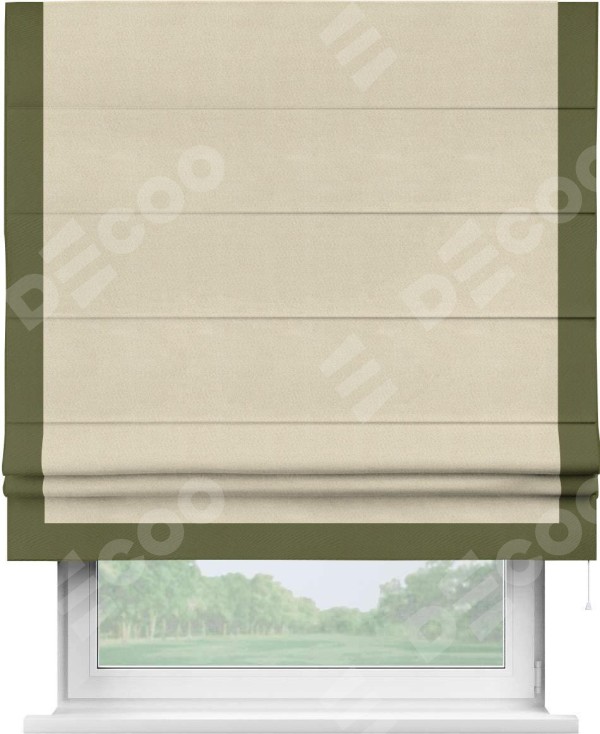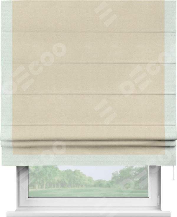 Римская штора производителя «Cortin», используется для проёма, пошита из ткани блэкаут однотонный бежевый, артикул ткани 13125. Отделка шторы кантом «Виктория», ткань для канта используется из блэкаута однотонного разной расцветки на выбор. Имеет универсальный механизм и подходит для монтажа: на потолок, на стену и в нишу.