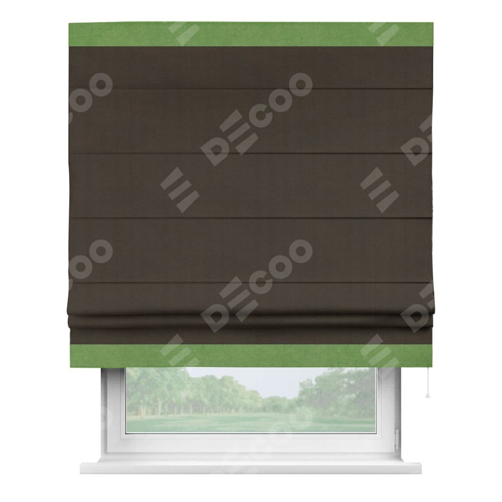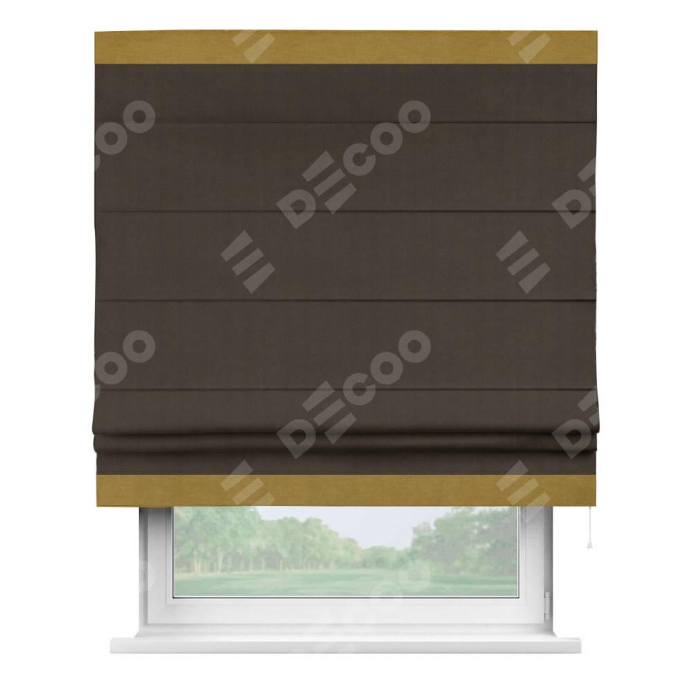 Римская штора производителя «Cortin», используется для проёма, пошита из ткани вельвет тёмно-коричневый, артикул ткани 30991. Отделка шторы кантом «Горизонт», ткань для канта используется из вельвета разной расцветки на выбор. Имеет универсальный механизм и подходит для монтажа: на потолок, на стену и в нишу.