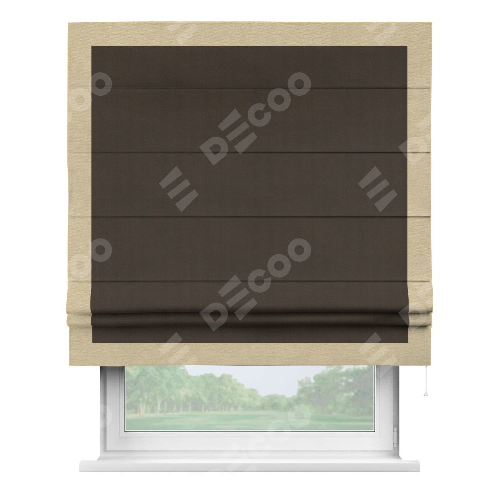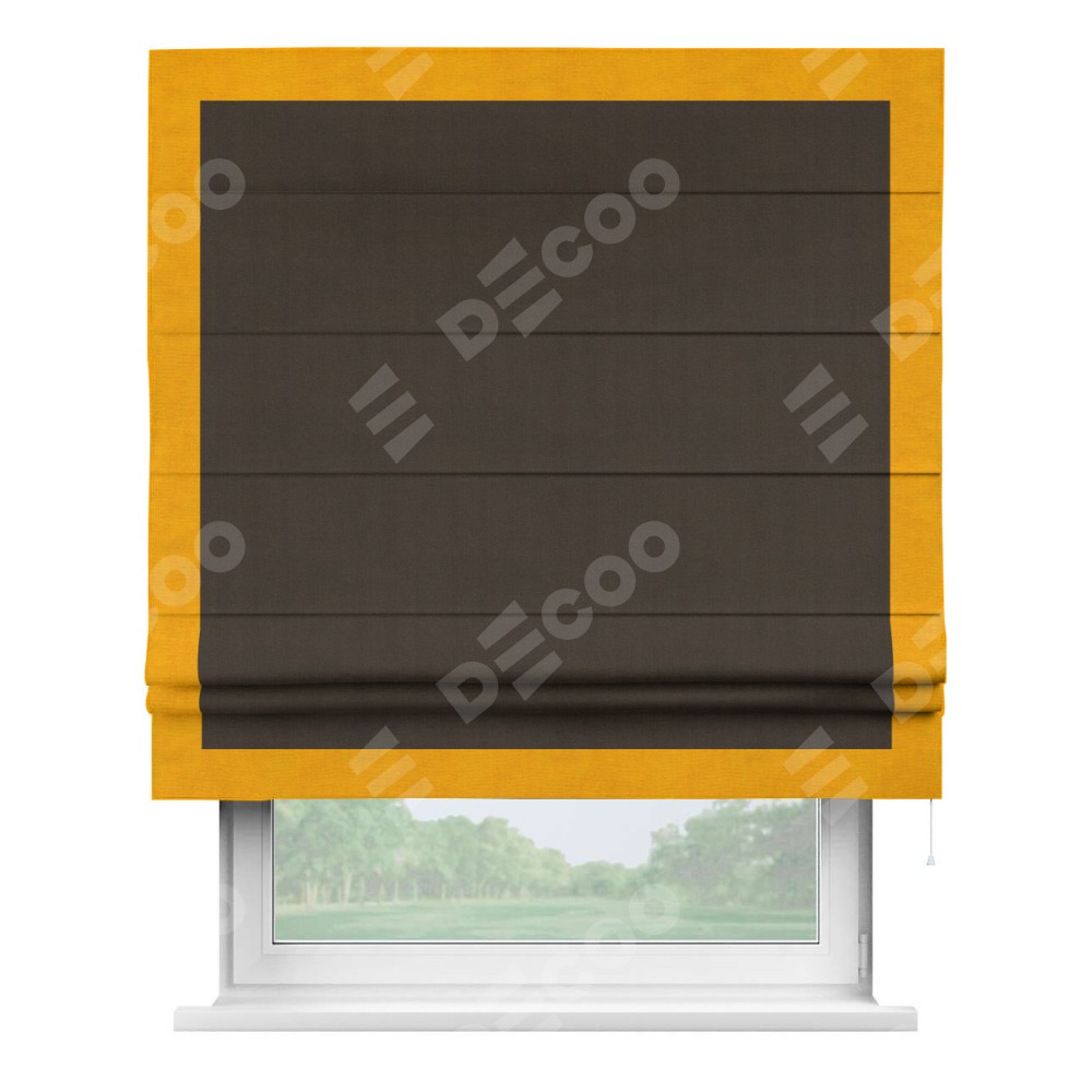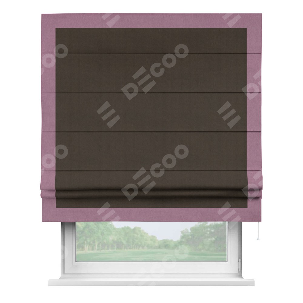 Римская штора производителя «Cortin», используется для проёма, пошита из ткани вельвет тёмно-коричневый, артикул ткани 30991. Отделка шторы кантом «Чесс», ткань для канта используется из вельвета разной расцветки на выбор. Имеет универсальный механизм и подходит для монтажа: на потолок, на стену и в нишу.