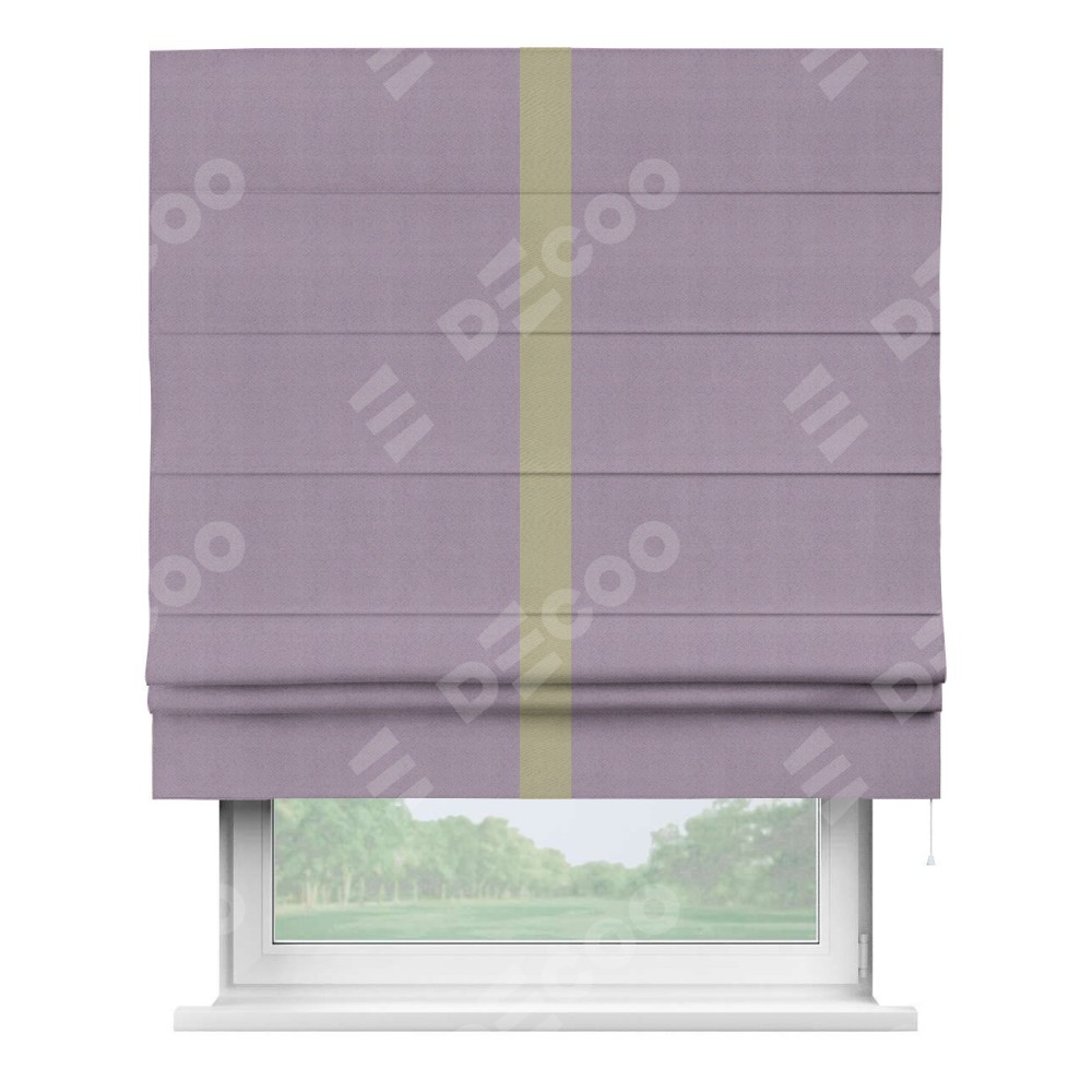 Римская штора производителя «Cortin», используется для проёма, пошита из ткани блэкаут однотонный светло-сиреневый, артикул ткани 29333−1. Отделка шторы кантом «Хайвей», ткань для канта используется из блэкаута однотонного разной расцветки на выбор. Имеет универсальный механизм и подходит для монтажа: на потолок, на стену и в нишу.