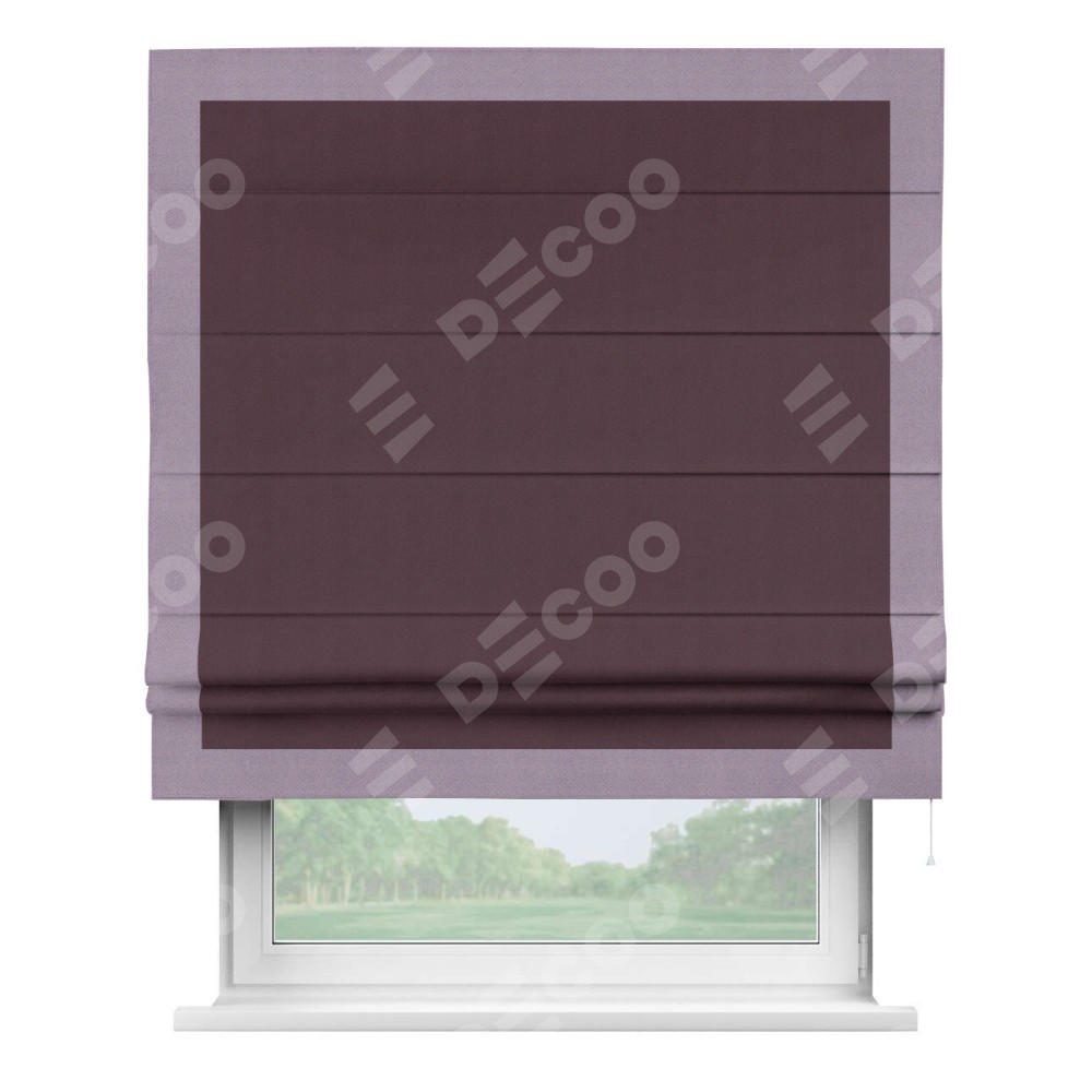 Римская штора производителя «Cortin», используется для проёма, пошита из ткани блэкаут однотонный сиреневый, артикул ткани 29333−2. Отделка шторы кантом «Чесс», ткань для канта используется из блэкаута однотонного разной расцветки на выбор. Имеет универсальный механизм и подходит для монтажа: на потолок, на стену и в нишу.