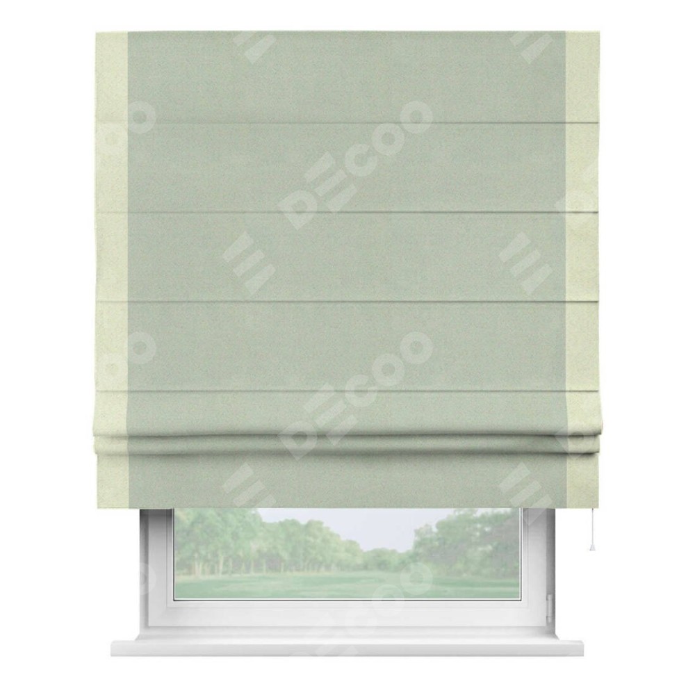 Римская штора производителя «Cortin», используется для проёма, пошита из ткани блэкаут однотонный светло-серый, артикул ткани 29332−2. Отделка шторы кантом «Стрим Дуо», ткань для канта используется из блэкаута однотонного разной расцветки на выбор. Имеет универсальный механизм и подходит для монтажа: на потолок, на стену и в нишу.