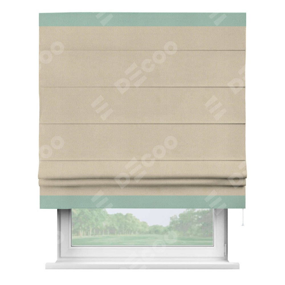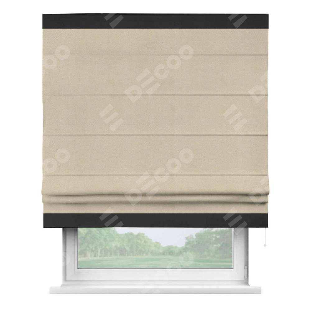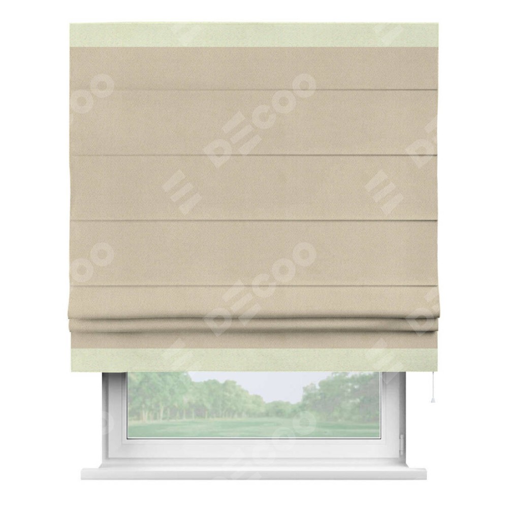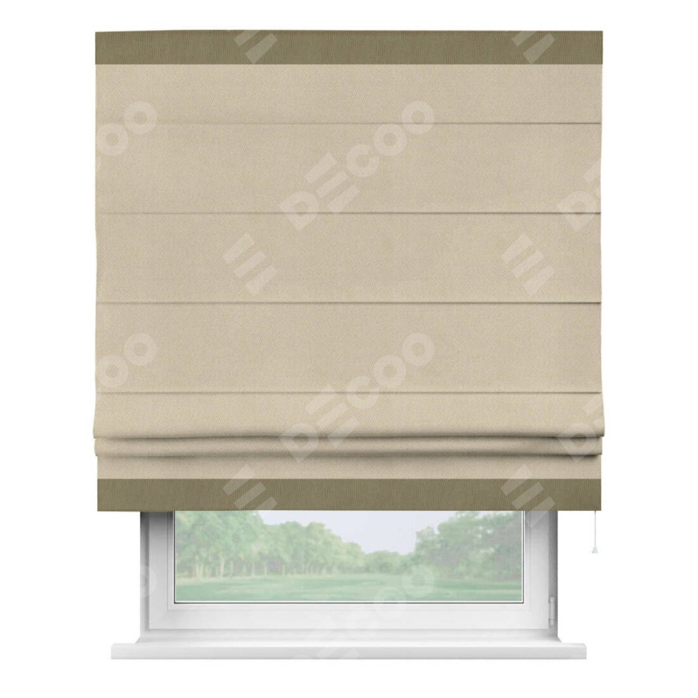 Римская штора производителя «Cortin», используется для проёма, пошита из ткани блэкаут однотонный кофейно-бежевый, артикул ткани 12095−1. Отделка шторы кантом «Горизонт», ткань для канта используется из блэкаута однотонного разной расцветки на выбор. Имеет универсальный механизм и подходит для монтажа: на потолок, на стену и в нишу.