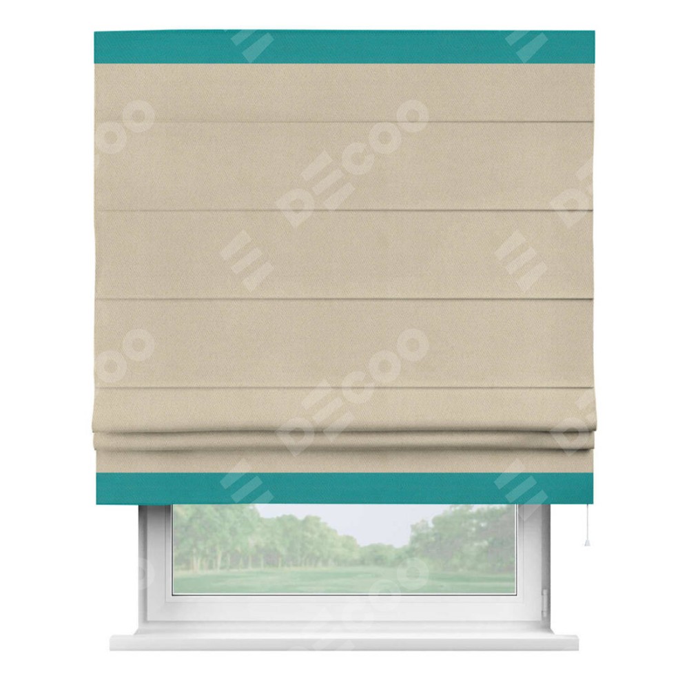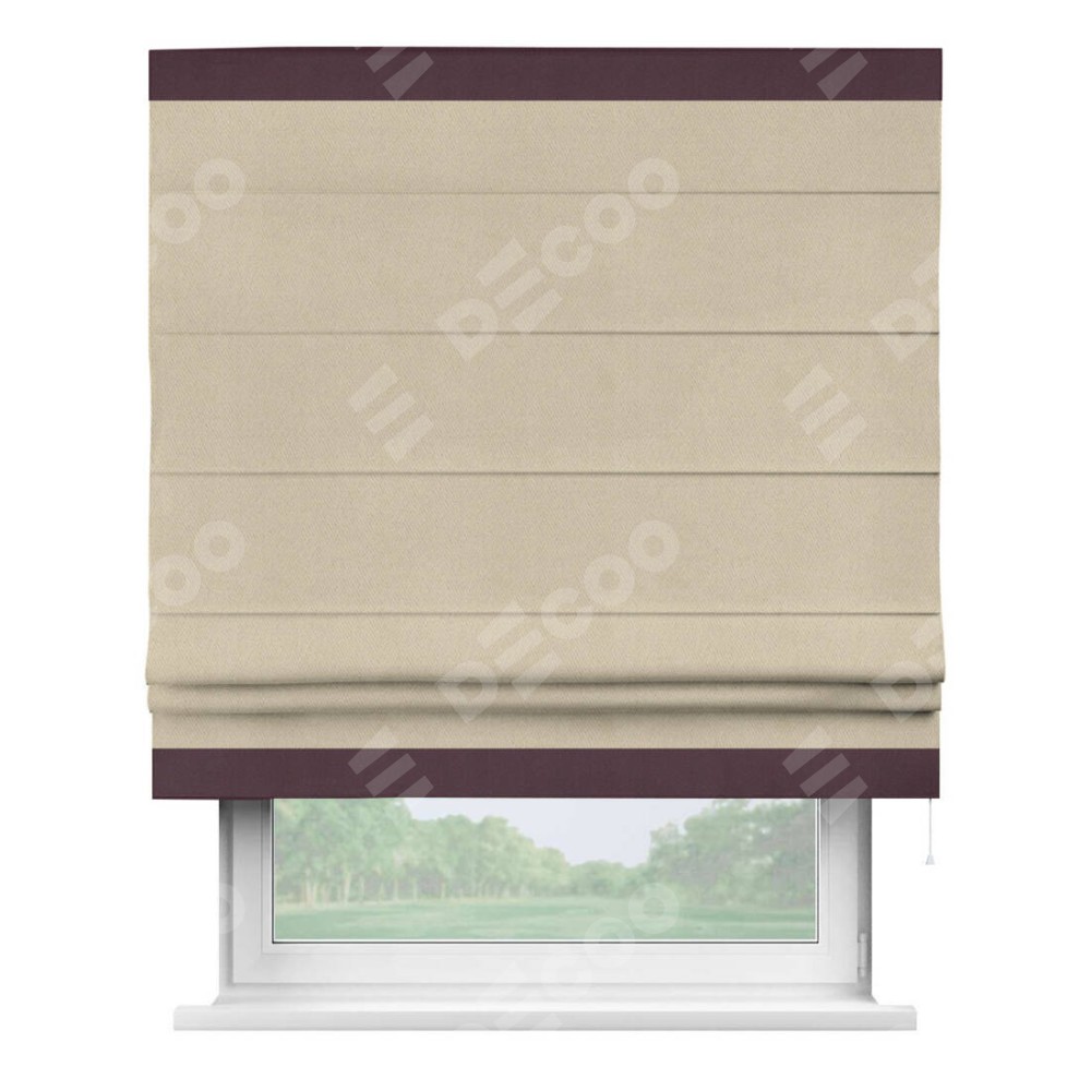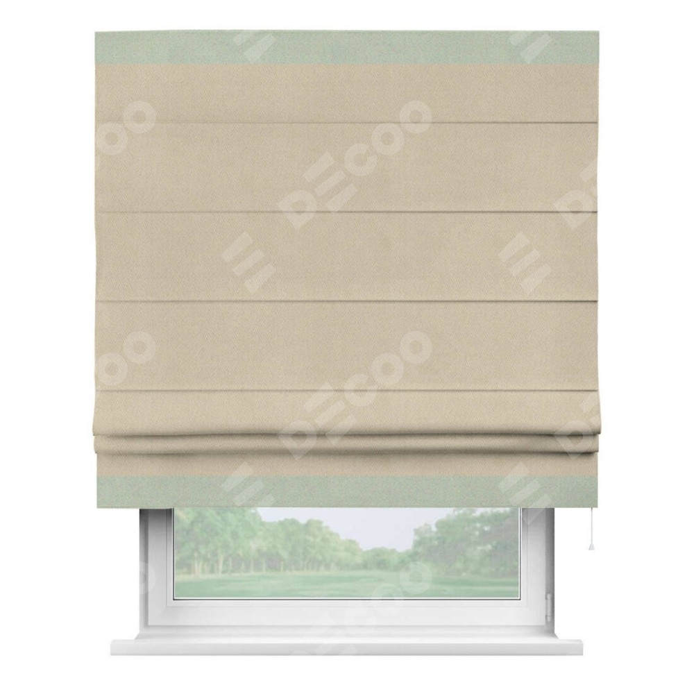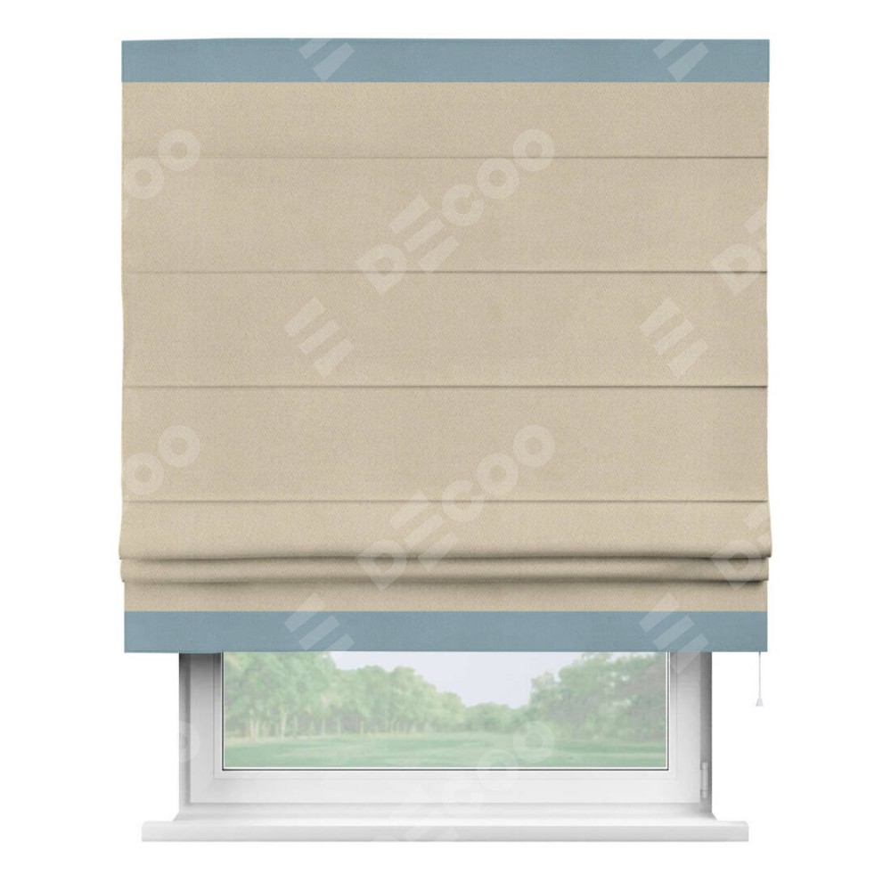 Римская штора производителя «Cortin», используется для проёма, пошита из ткани блэкаут однотонный кофейно-бежевый, артикул ткани 12095−1. Отделка шторы кантом «Горизонт», ткань для канта используется из блэкаута однотонного разной расцветки на выбор. Имеет универсальный механизм и подходит для монтажа: на потолок, на стену и в нишу.