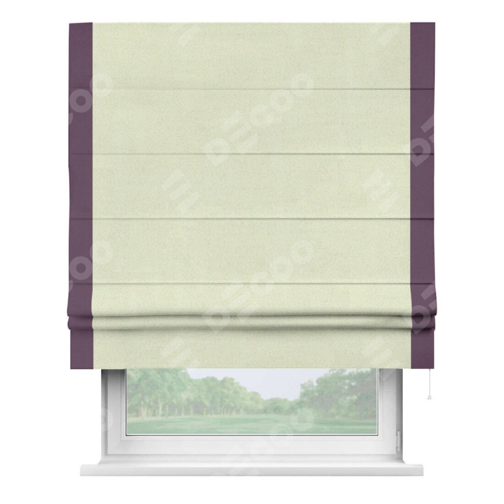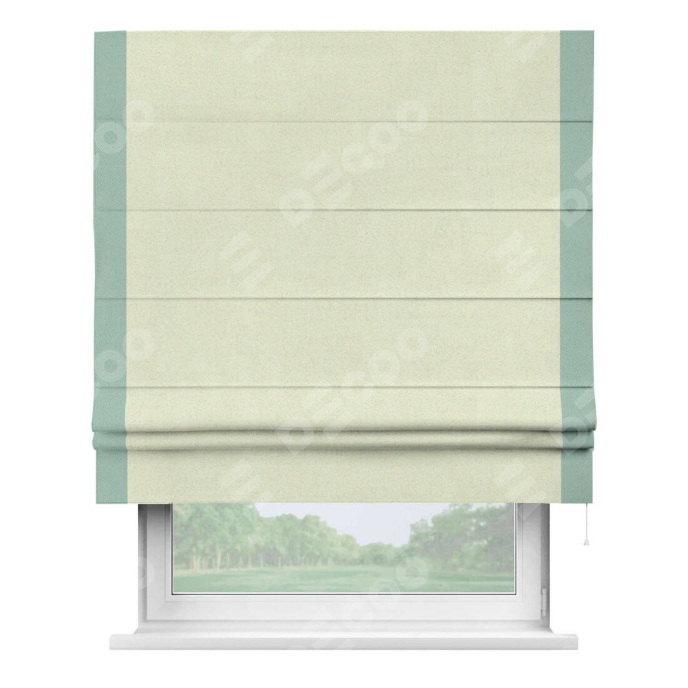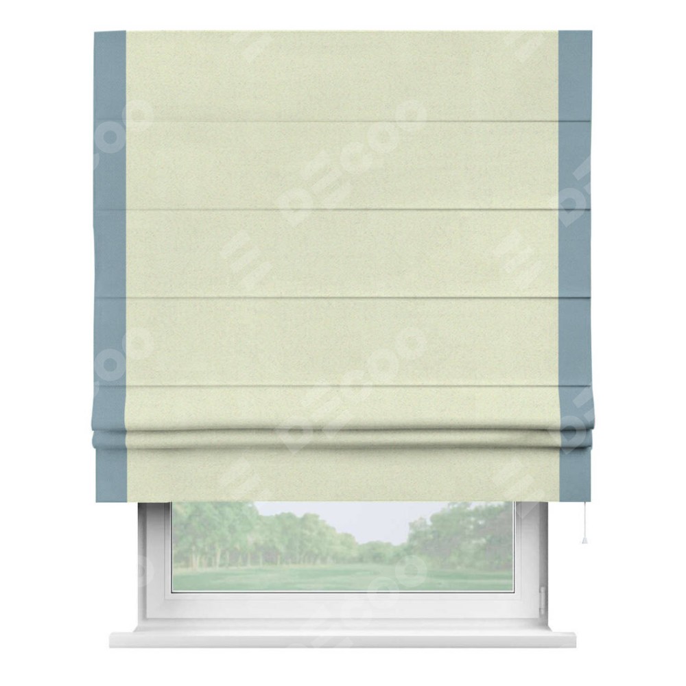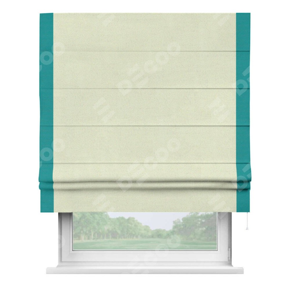 Римская штора производителя «Cortin», используется для проёма, пошита из ткани блэкаут однотонный сливочный, артикул ткани 6668−02. Отделка шторы кантом «Стрим Дуо», ткань для канта используется из блэкаута однотонного разной расцветки на выбор. Имеет универсальный механизм и подходит для монтажа: на потолок, на стену и в нишу.