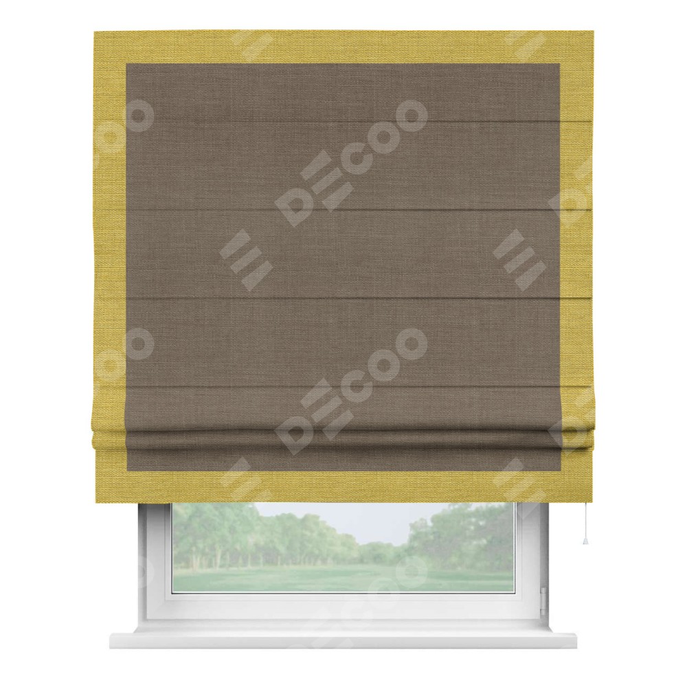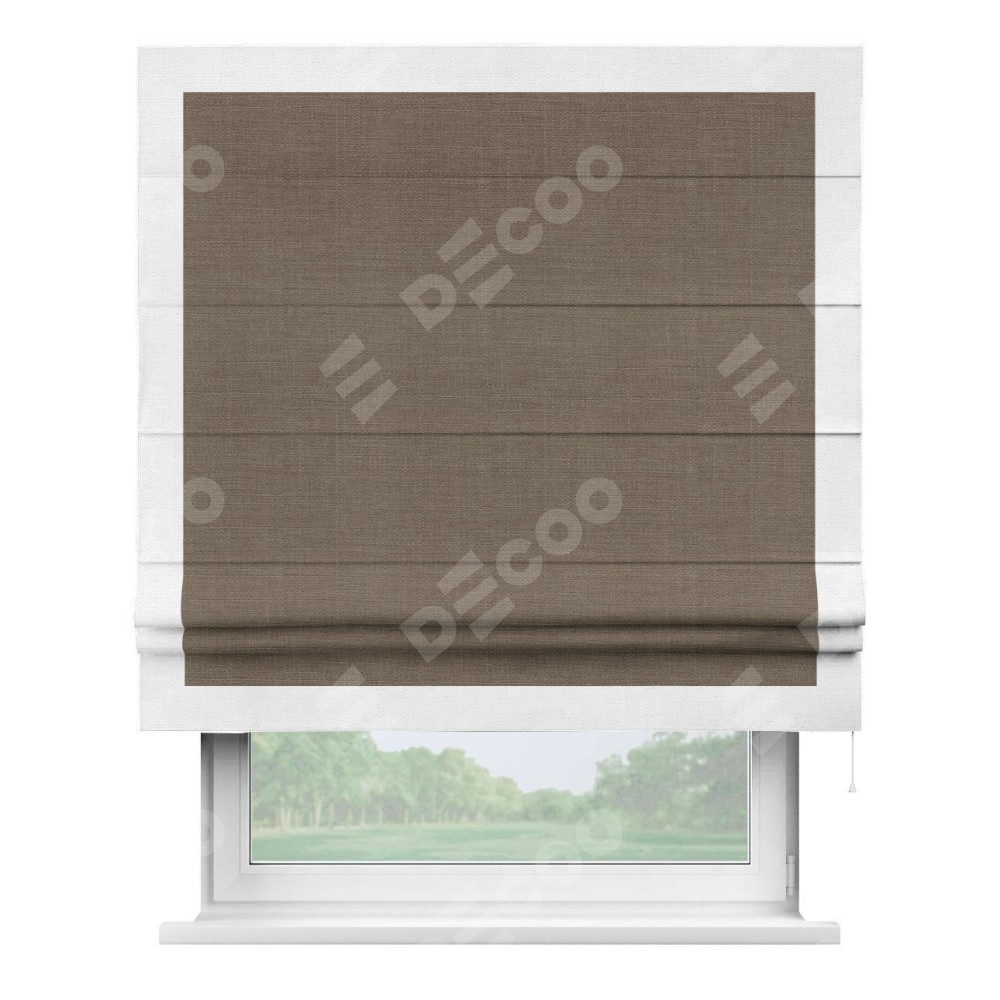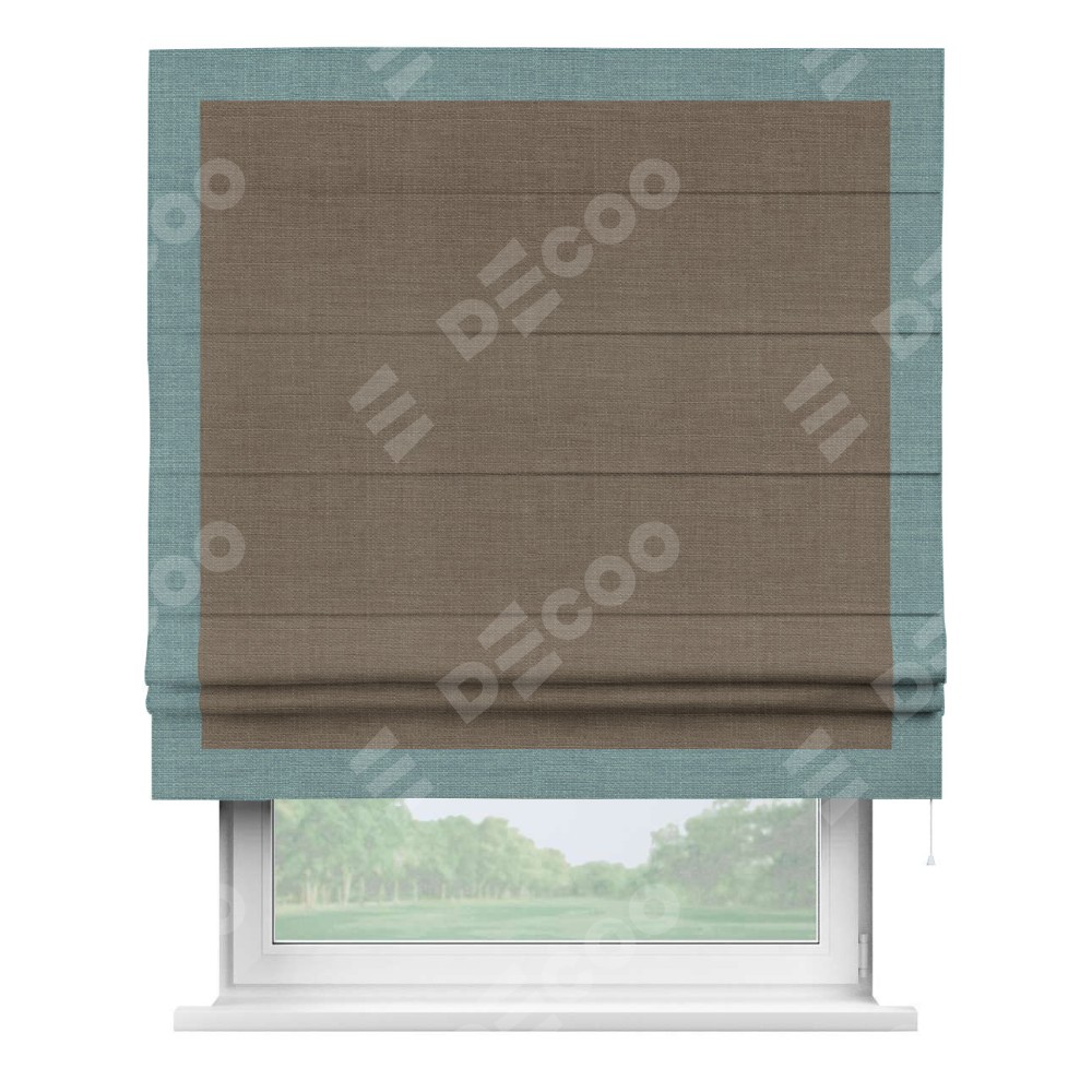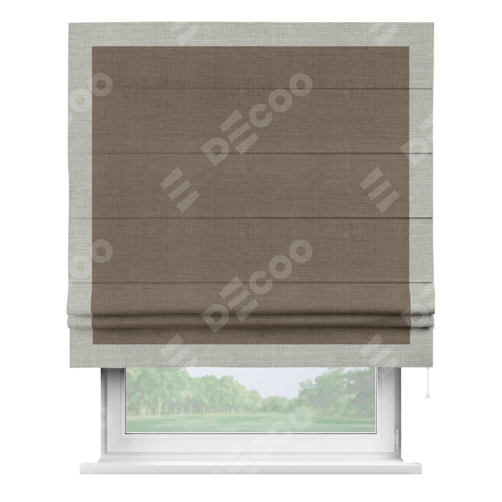 Римская штора производителя «Cortin», используется для проёма, пошита из ткани лён мокко, артикул 7444. Отделка шторы кантом «Чесс», ткань для канта используется из льна разной расцветки на выбор. Имеет универсальный механизм и подходит для монтажа: на потолок, на стену и в нишу.
