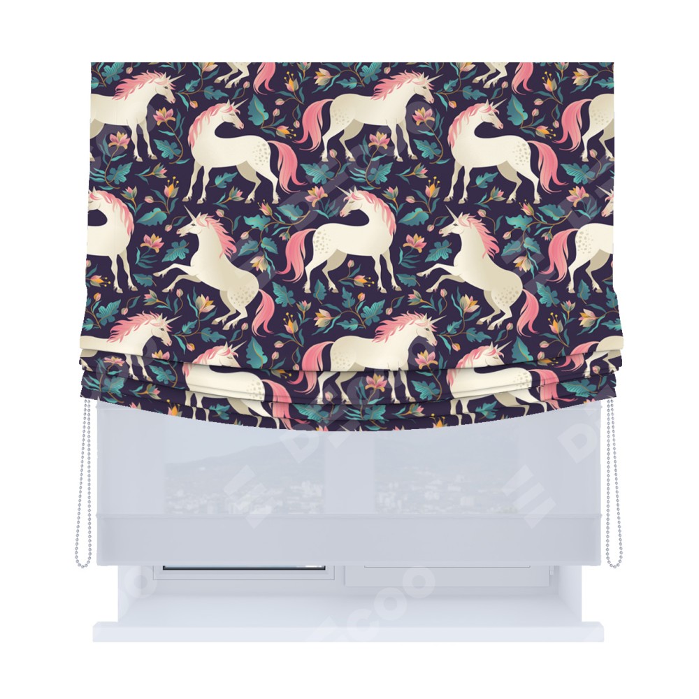 Римская штора «Кортин», день-ночь с мягкими складками, «Сказочные единороги»