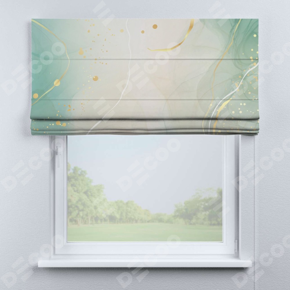 Римская штора производителя «Cortin», используется для проёма, пошита из ткани блэкаут с нанесением сублимационной печати «Изумрудно-серый мрамор». Имеет универсальный механизм и подходит для монтажа: на потолок, на стену и в нишу.