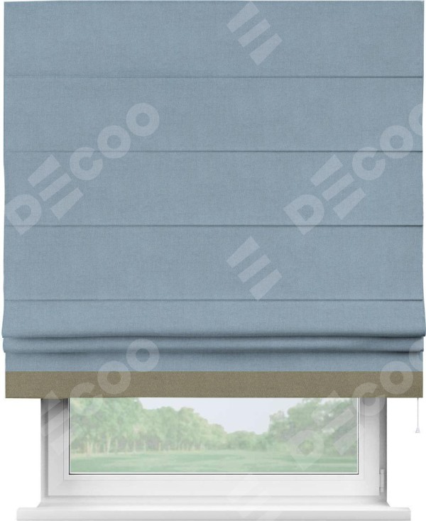 Римская штора производителя «Cortin», используется для проёма, пошита из ткани лён блэкаут голубой, артикул 69574. Отделка шторы кантом «Джестер», ткань для канта используется из льна разной расцветки на выбор. Имеет универсальный механизм и подходит для монтажа: на потолок, на стену и в нишу.