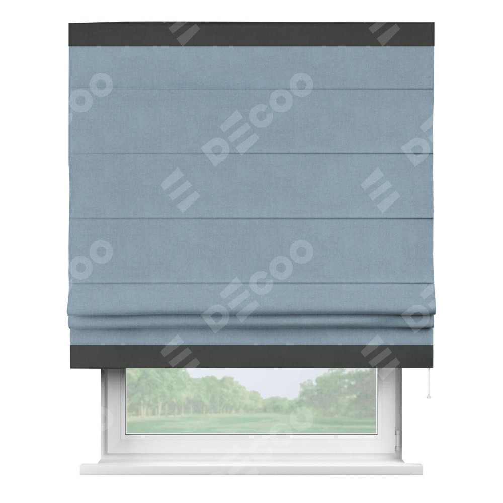 Римская штора производителя «Cortin», используется для проёма, пошита из ткани лён блэкаут голубой, артикул 69574. Отделка шторы кантом «Горизонт», ткань для канта используется из льна разной расцветки на выбор. Имеет универсальный механизм и подходит для монтажа: на потолок, на стену и в нишу.
