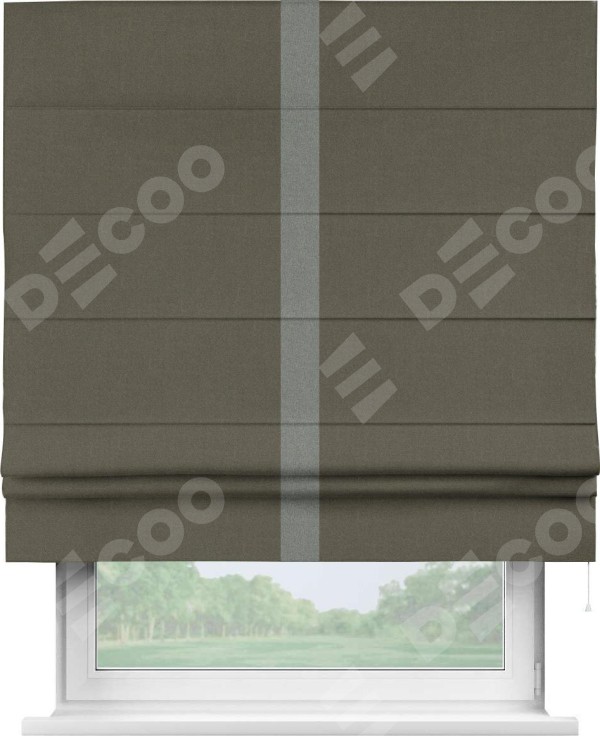 Римская штора производителя «Cortin», используется для проёма, пошита из ткани лён блэкаут коричневый, артикул 69383. Отделка шторы кантом «Хайвэй», ткань для канта используется из льна разной расцветки на выбор. Имеет универсальный механизм и подходит для монтажа: на потолок, на стену и в нишу.