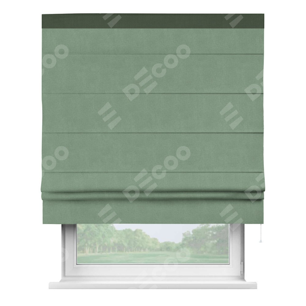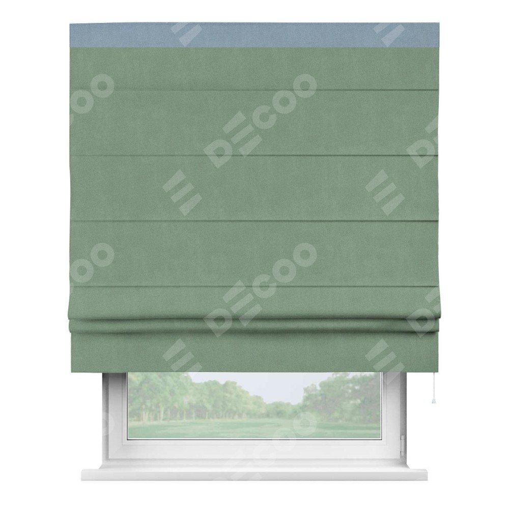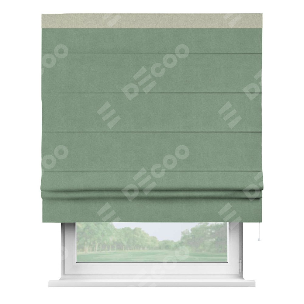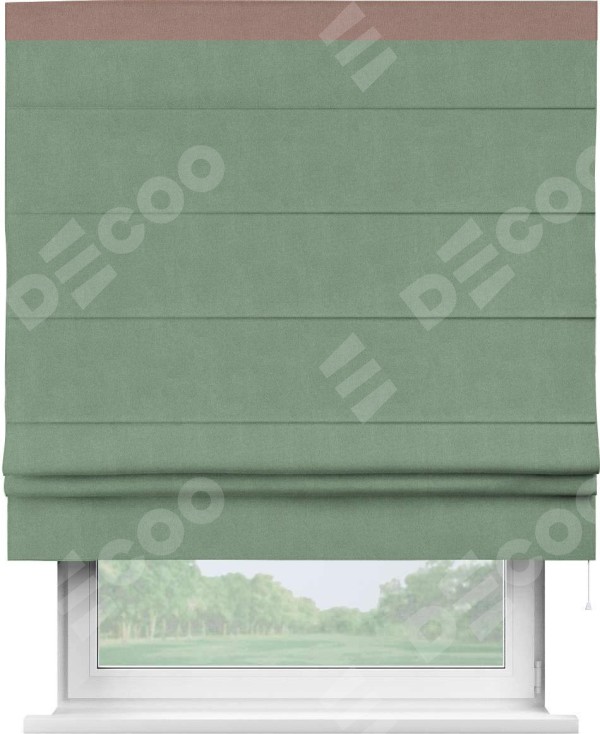 Римская штора производителя «Cortin», используется для проёма, пошита из ткани лён блэкаут светло-бирюзовый, артикул 69443. Отделка шторы кантом «Кинг», ткань для канта используется из льна разной расцветки на выбор. Имеет универсальный механизм и подходит для монтажа: на потолок, на стену и в нишу.