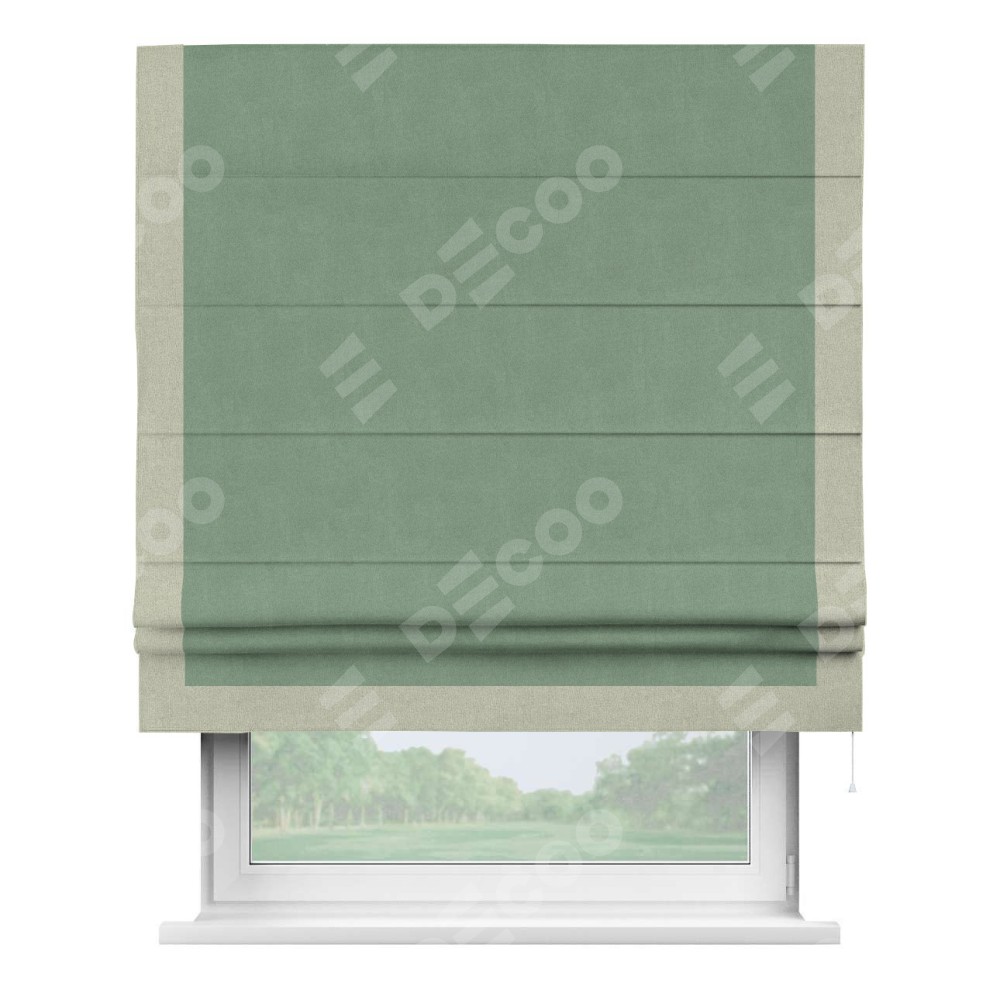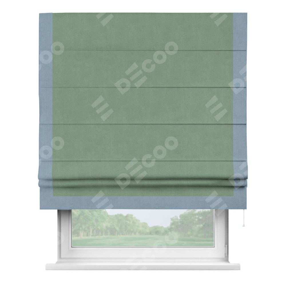 Римская штора производителя «Cortin», используется для проёма, пошита из ткани лён блэкаут светло-бирюзовый, артикул 69443. Отделка шторы кантом «Виктория», ткань для канта используется из льна разной расцветки на выбор. Имеет универсальный механизм и подходит для монтажа: на потолок, на стену и в нишу.