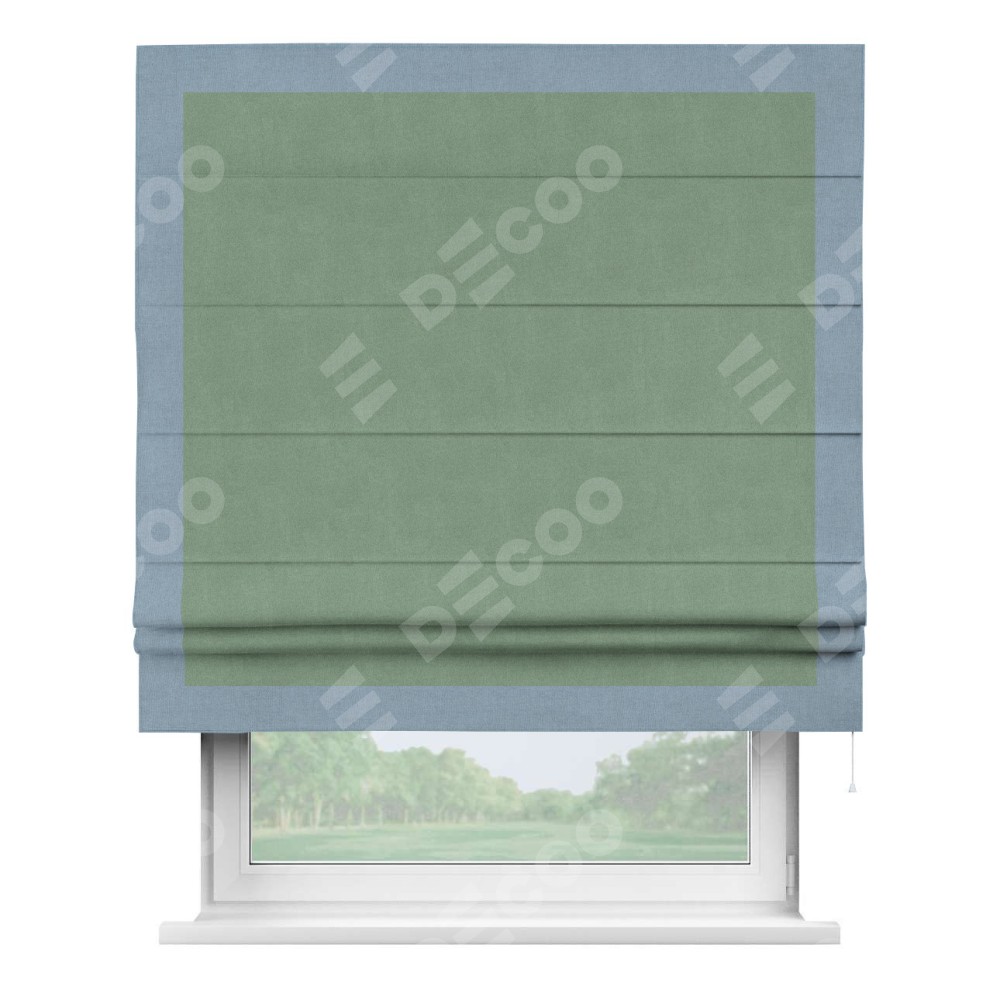 Римская штора производителя «Cortin», используется для проёма, пошита из ткани лён блэкаут светло-бирюзовый, артикул 69443. Отделка шторы кантом «Чесс», ткань для канта используется из льна разной расцветки на выбор. Имеет универсальный механизм и подходит для монтажа: на потолок, на стену и в нишу.