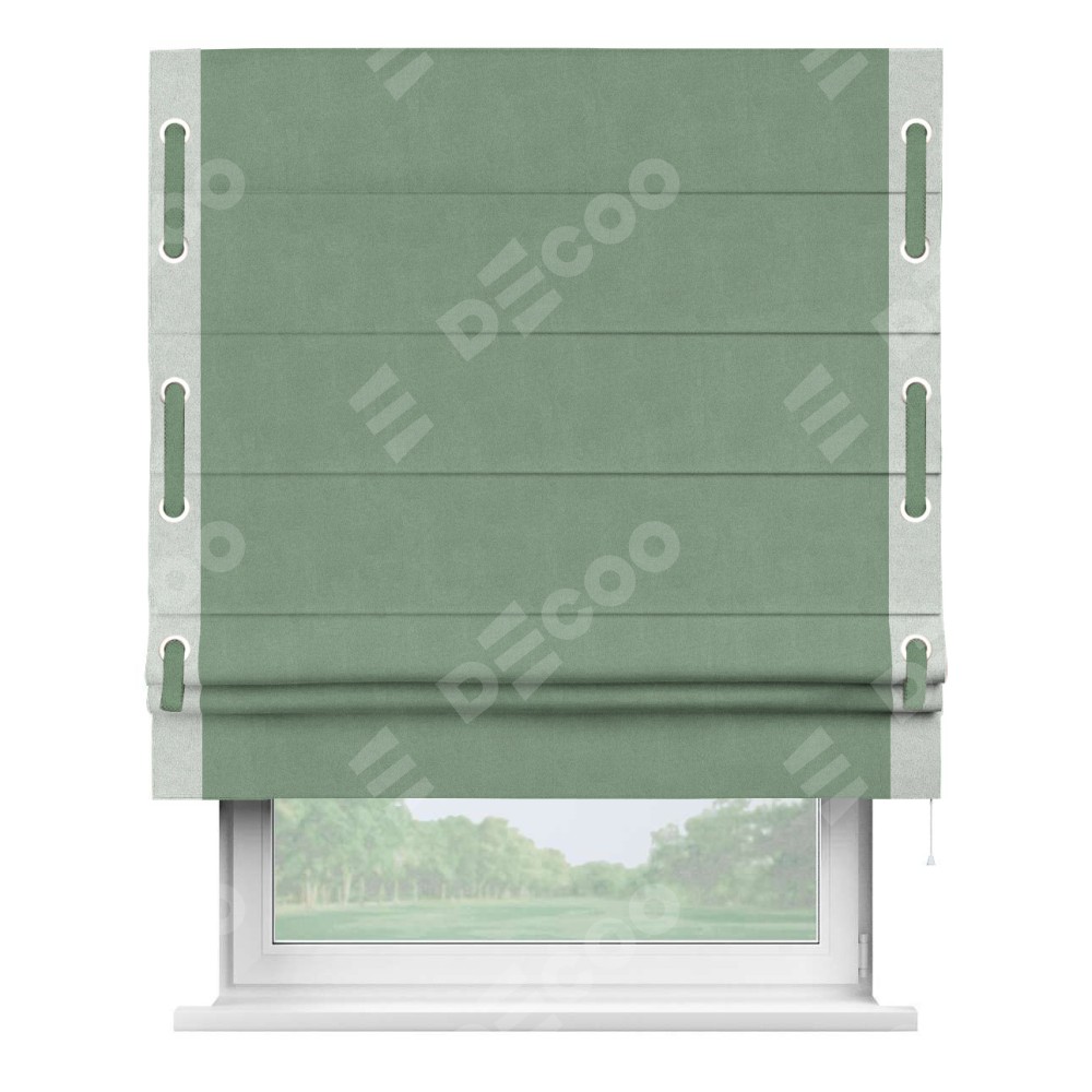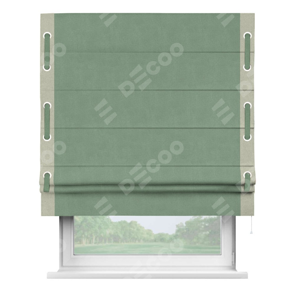 Римская штора производителя «Cortin», используется для проёма, пошита из ткани лён блэкаут светло-бирюзовый, артикул 69443. Отделка шторы кантом «Стрим Дуо» на кантах расположены люверсы с пояском, ткань для канта используется из льна разной расцветки на выбор. Ткань для пояска обычно используется из основной ткани шторы, а так же можно сделать из любой расцветки по желанию. Имеет универсальный механизм и подходит для монтажа: на потолок, на стену и в нишу.