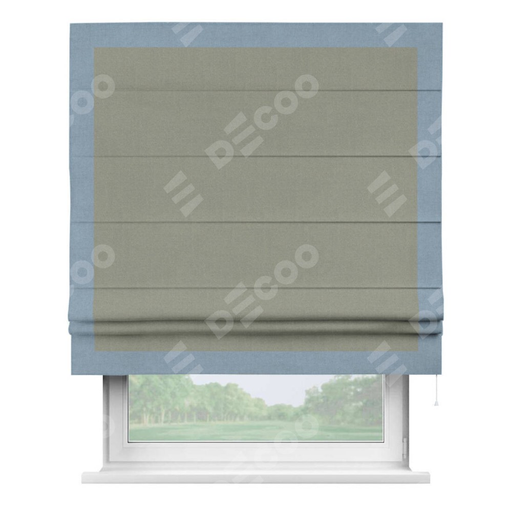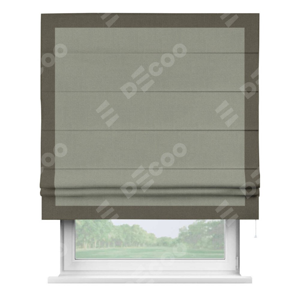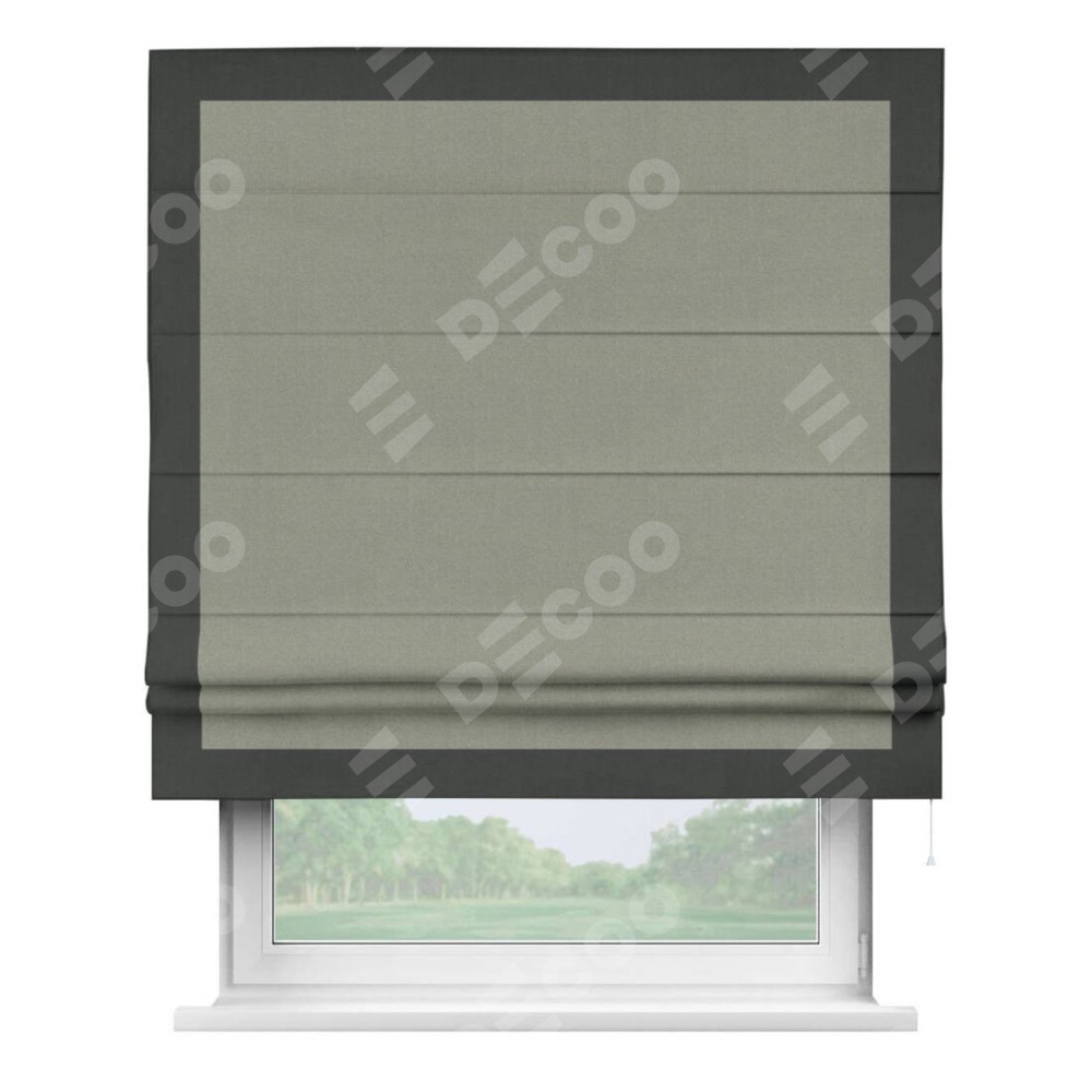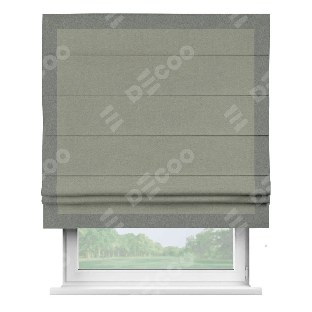 Римская штора производителя «Cortin», используется для проёма, пошита из ткани лён блэкаут светло-серый, артикул 69446. Отделка шторы кантом «Чесс», ткань для канта используется из льна разной расцветки на выбор. Имеет универсальный механизм и подходит для монтажа: на потолок, на стену и в нишу.