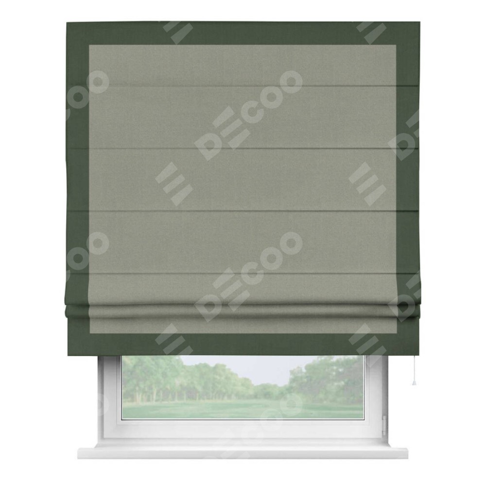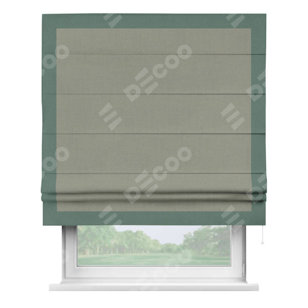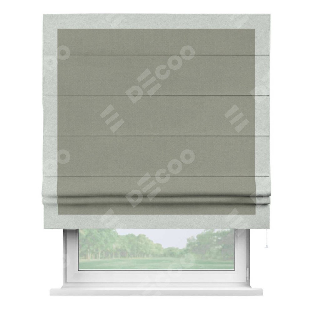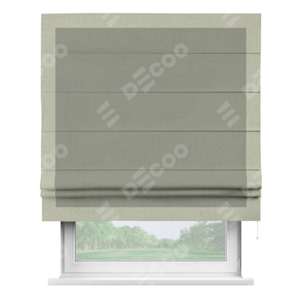 Римская штора производителя «Cortin», используется для проёма, пошита из ткани лён блэкаут светло-серый, артикул 69446. Отделка шторы кантом «Чесс», ткань для канта используется из льна разной расцветки на выбор. Имеет универсальный механизм и подходит для монтажа: на потолок, на стену и в нишу.