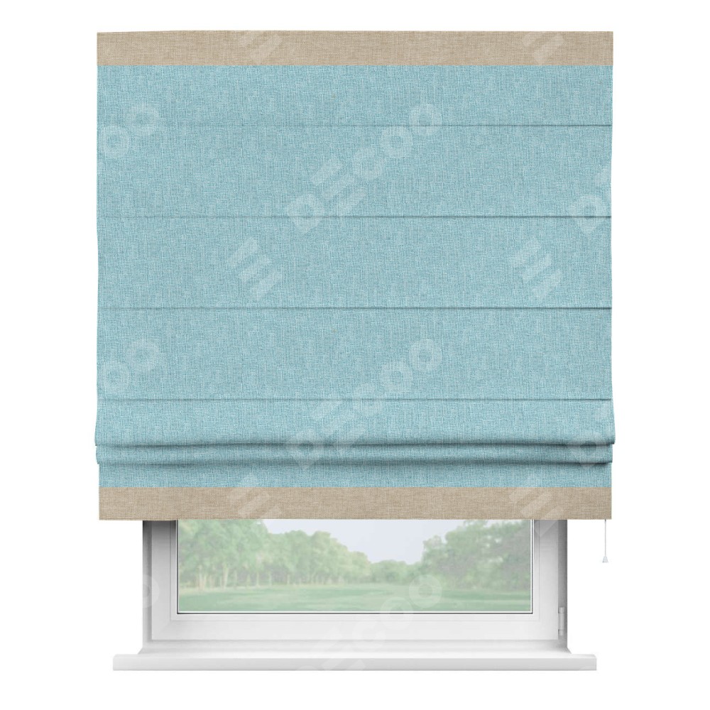 Римская штора производителя «Cortin», используется для проёма, пошита из ткани лён кашемир голубой, артикул 21616. Отделка шторы кантом «Горизонт», ткань для канта используется из льна разной расцветки на выбор. Имеет универсальный механизм и подходит для монтажа: на потолок, на стену и в нишу.