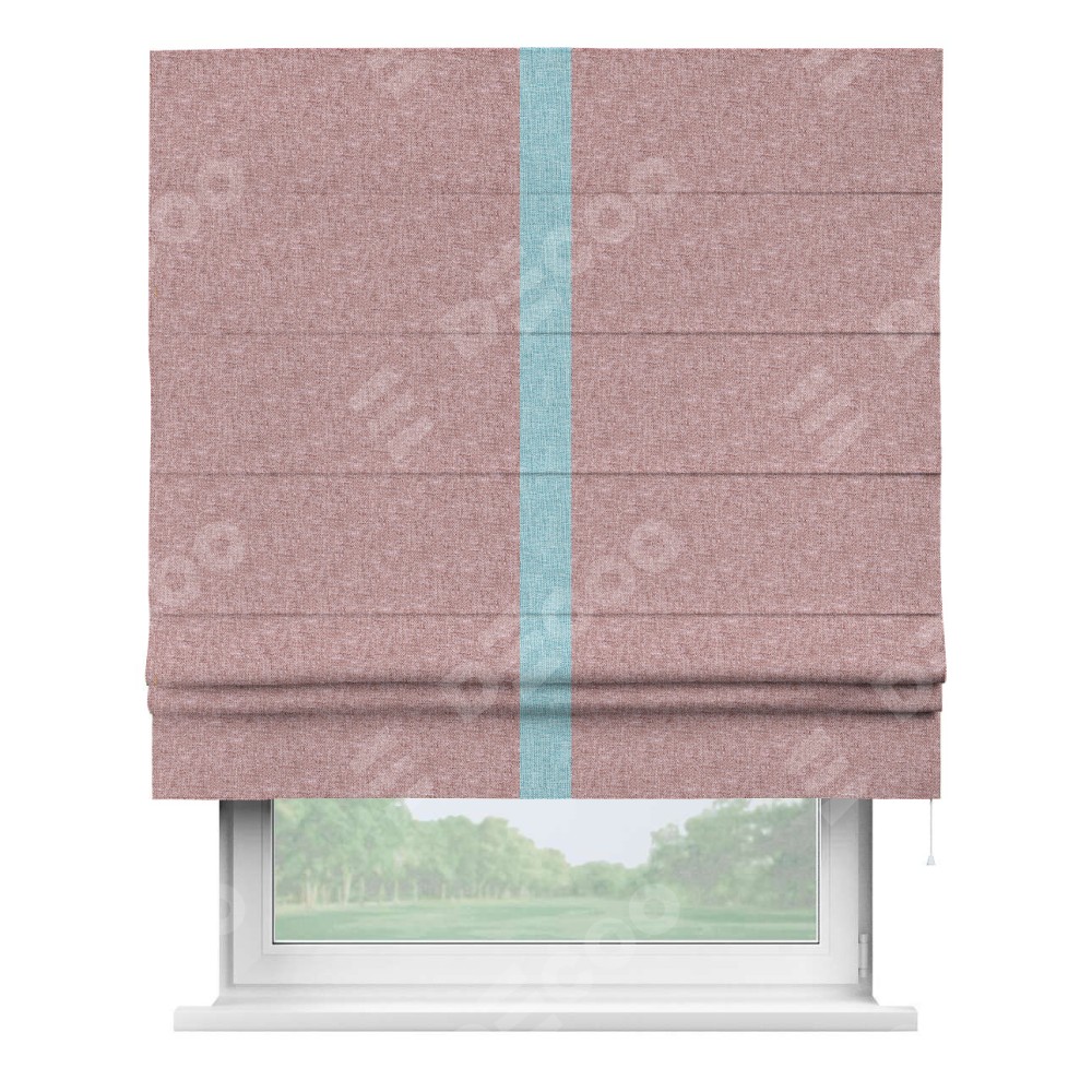 Римская штора производителя «Cortin», используется для проёма, пошита из ткани лён кашемир розовая пудра, артикул 21619. Отделка шторы кантом «Хайвэй», ткань для канта используется из льна разной расцветки на выбор. Имеет универсальный механизм и подходит для монтажа: на потолок, на стену и в нишу.