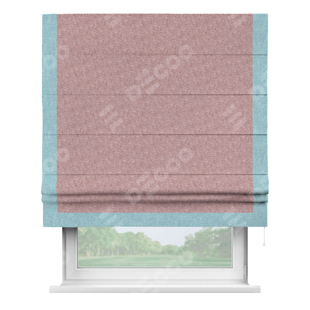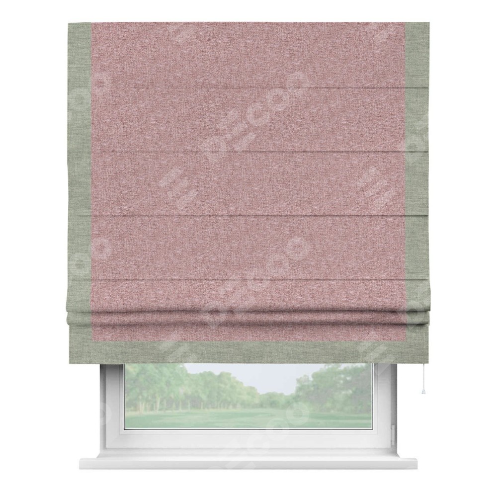 Римская штора производителя «Cortin», используется для проёма, пошита из ткани лён кашемир розовая пудра, артикул 21619. Отделка шторы кантом «Виктория», ткань для канта используется из льна разной расцветки на выбор. Имеет универсальный механизм и подходит для монтажа: на потолок, на стену и в нишу.