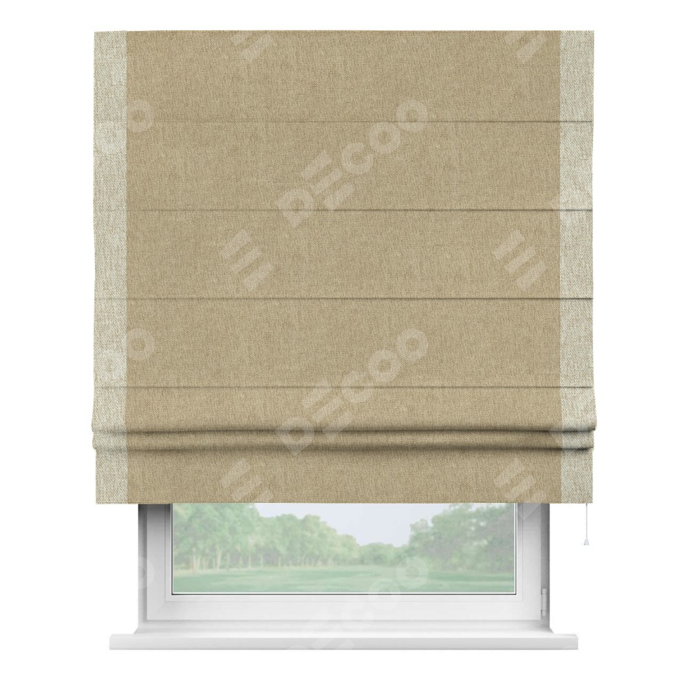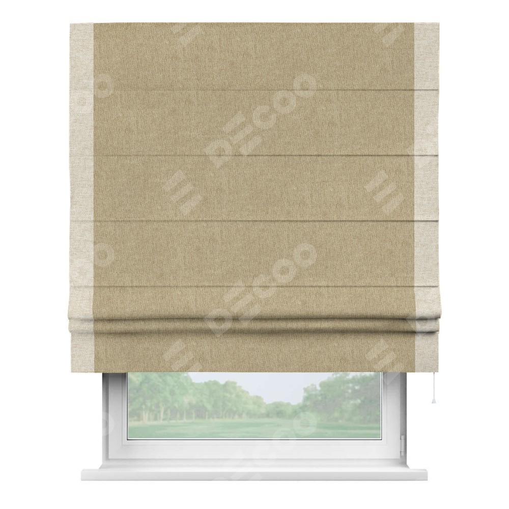 Римская штора производителя «Cortin», используется для проёма, пошита из ткани стиф димаут бежевый, артикул 18083. Отделка шторы кантом «Стрим Дуо», ткань для канта используется из стифа разной расцветки на выбор. Имеет универсальный механизм и подходит для монтажа: на потолок, на стену и в нишу.