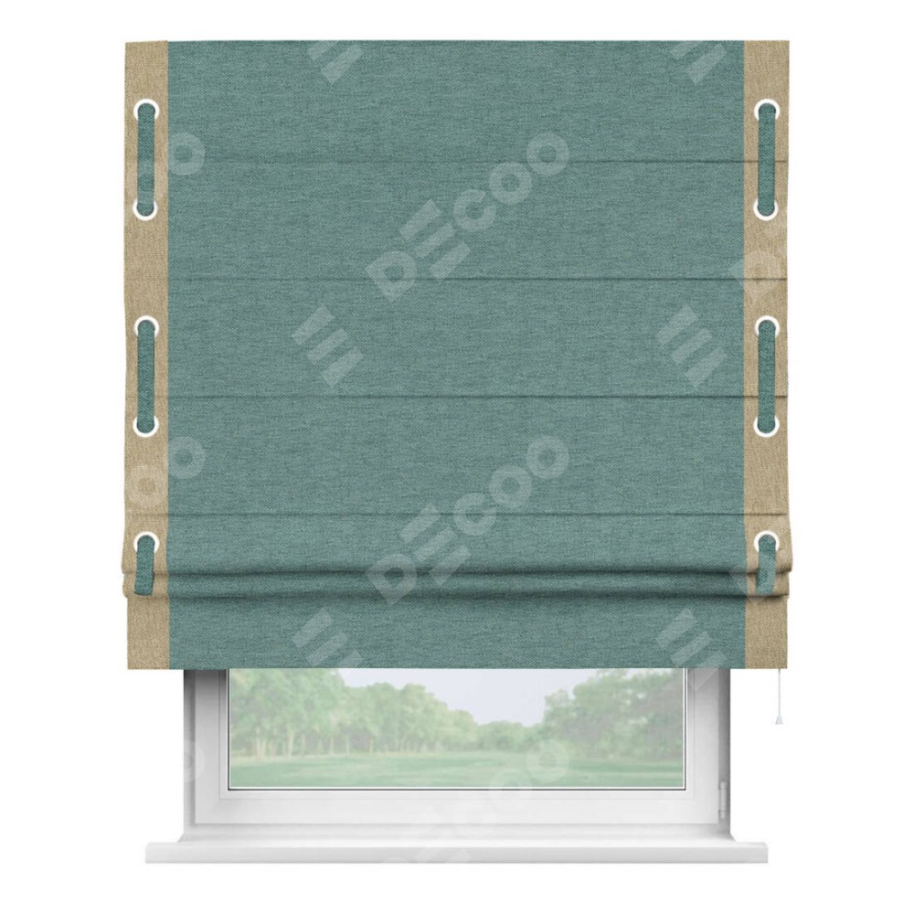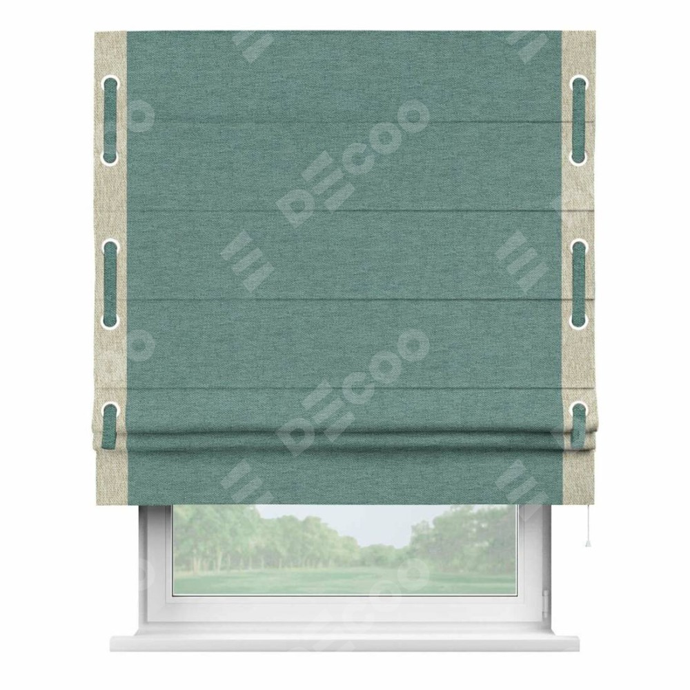Римская штора производителя «Cortin», используется для проёма, пошита из ткани стиф димаут бирюзовый, артикул 18196. Отделка шторы кантом «Стрим Дуо» на кантах расположены люверсы с пояском, ткань для канта используется из стифа разной расцветки на выбор. Ткань для пояска обычно используется из основной ткани шторы, а так же можно сделать из любой расцветки по желанию. Имеет универсальный механизм и подходит для монтажа: на потолок, на стену и в нишу.