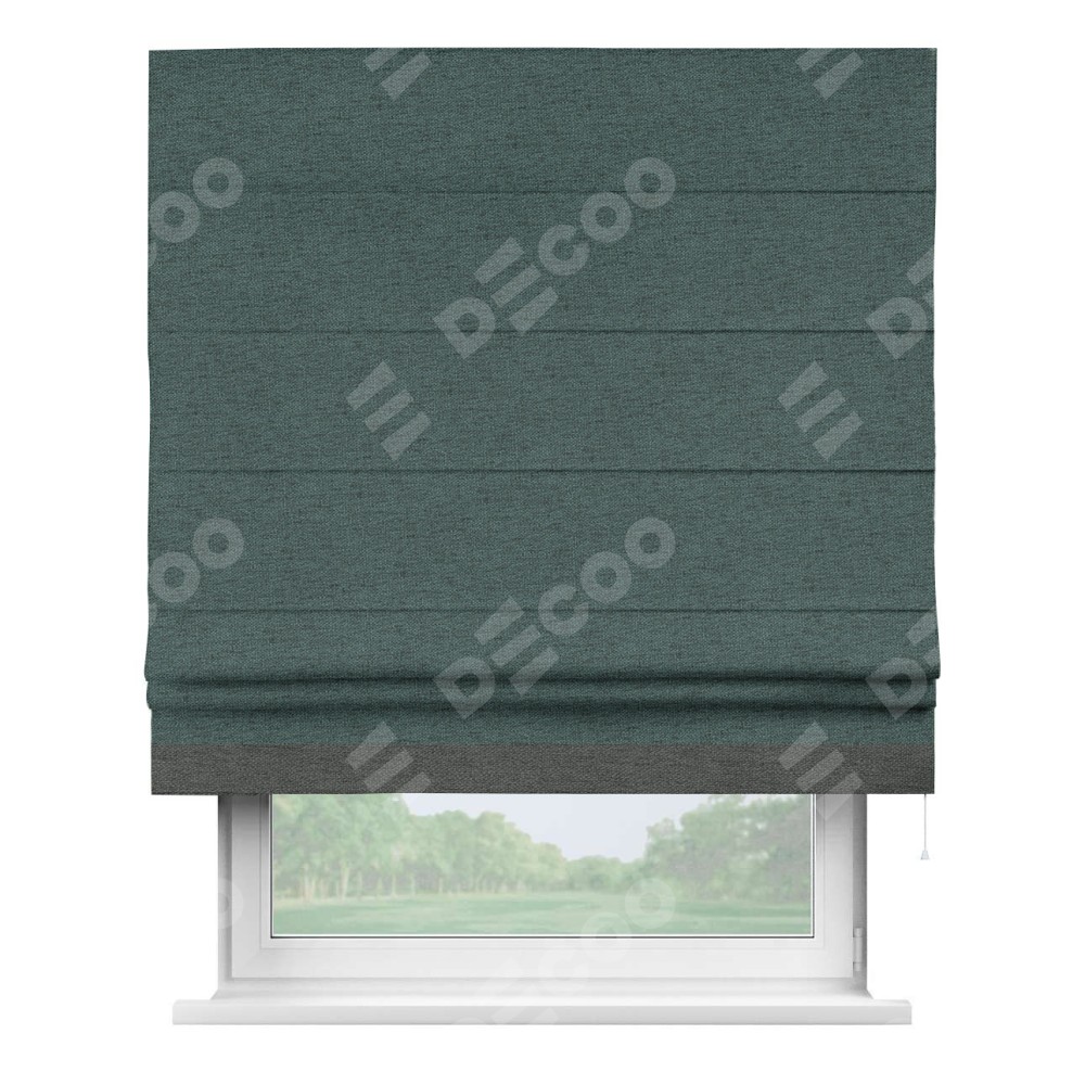 Римская штора производителя «Cortin», используется для проёма, пошита из ткани стиф димаут сине-зелёный, артикул 18194. Отделка шторы кантом «Джестер», ткань для канта используется из стифа разной расцветки на выбор. Имеет универсальный механизм и подходит для монтажа: на потолок, на стену и в нишу.