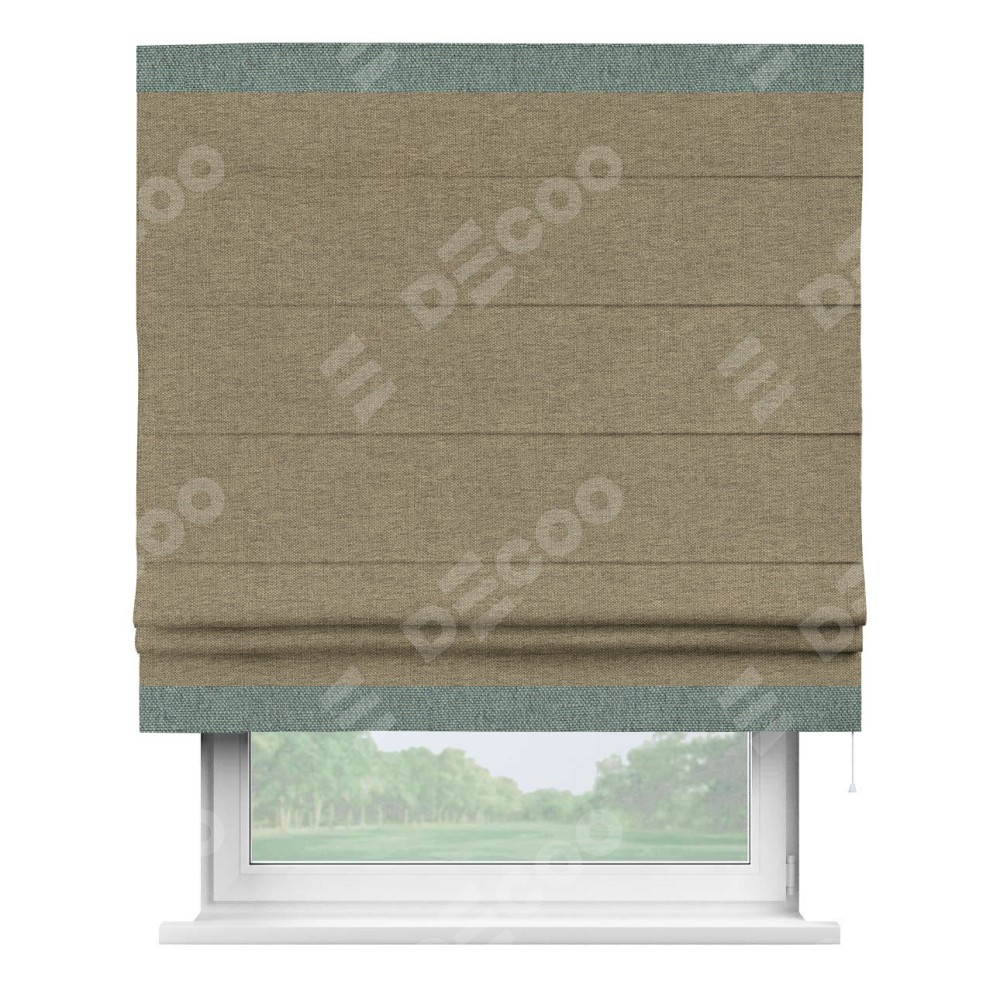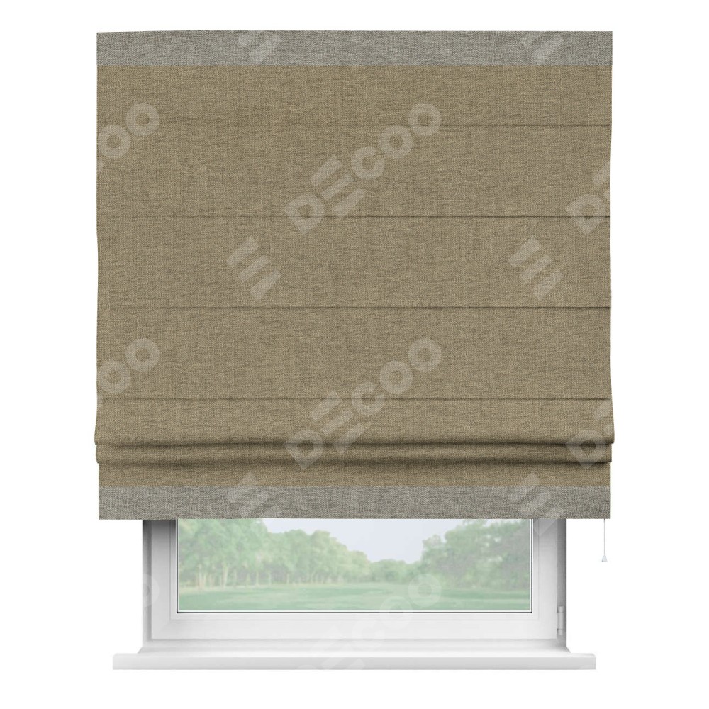 Римская штора производителя «Cortin», используется для проёма, пошита из ткани стиф димаут тёмно-бежевый, артикул 18085. Отделка шторы кантом «Горизонт», ткань для канта используется из стифа разной расцветки на выбор. Имеет универсальный механизм и подходит для монтажа: на потолок, на стену и в нишу.