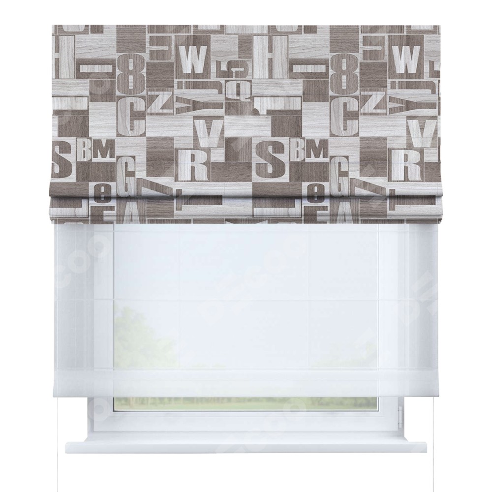 Римская штора день-ночь производителя «Cortin», используется для проёма, пошита из двух полотен, с лицевой блэкаут с нанесением сублимационной печати «Литеры лофт», вторая ткань тюль (по стандарту комплектуется тюль белого цвета артикул V-01). Имеет универсальный механизм и подходит для монтажа: на потолок, на стену и в нишу.