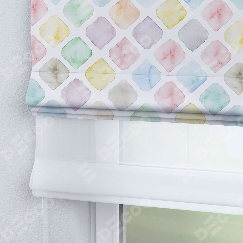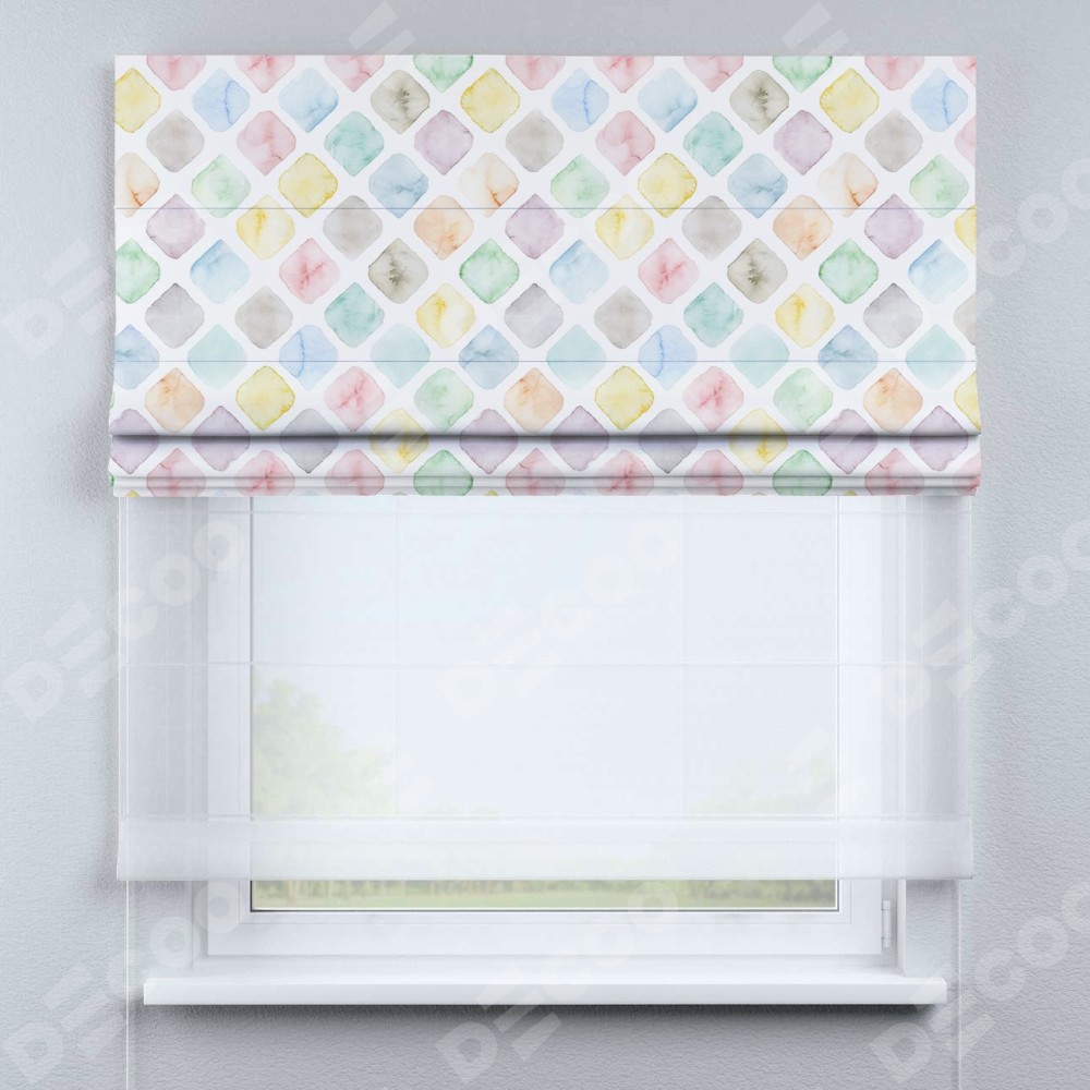 Римская штора день-ночь производителя «Cortin», используется для проёма, пошита из двух полотен, с лицевой блэкаут с нанесением сублимационной печати «Мозаика акварель», вторая ткань тюль (по стандарту комплектуется тюль белого цвета артикул V-01). Имеет универсальный механизм и подходит для монтажа: на потолок, на стену и в нишу.