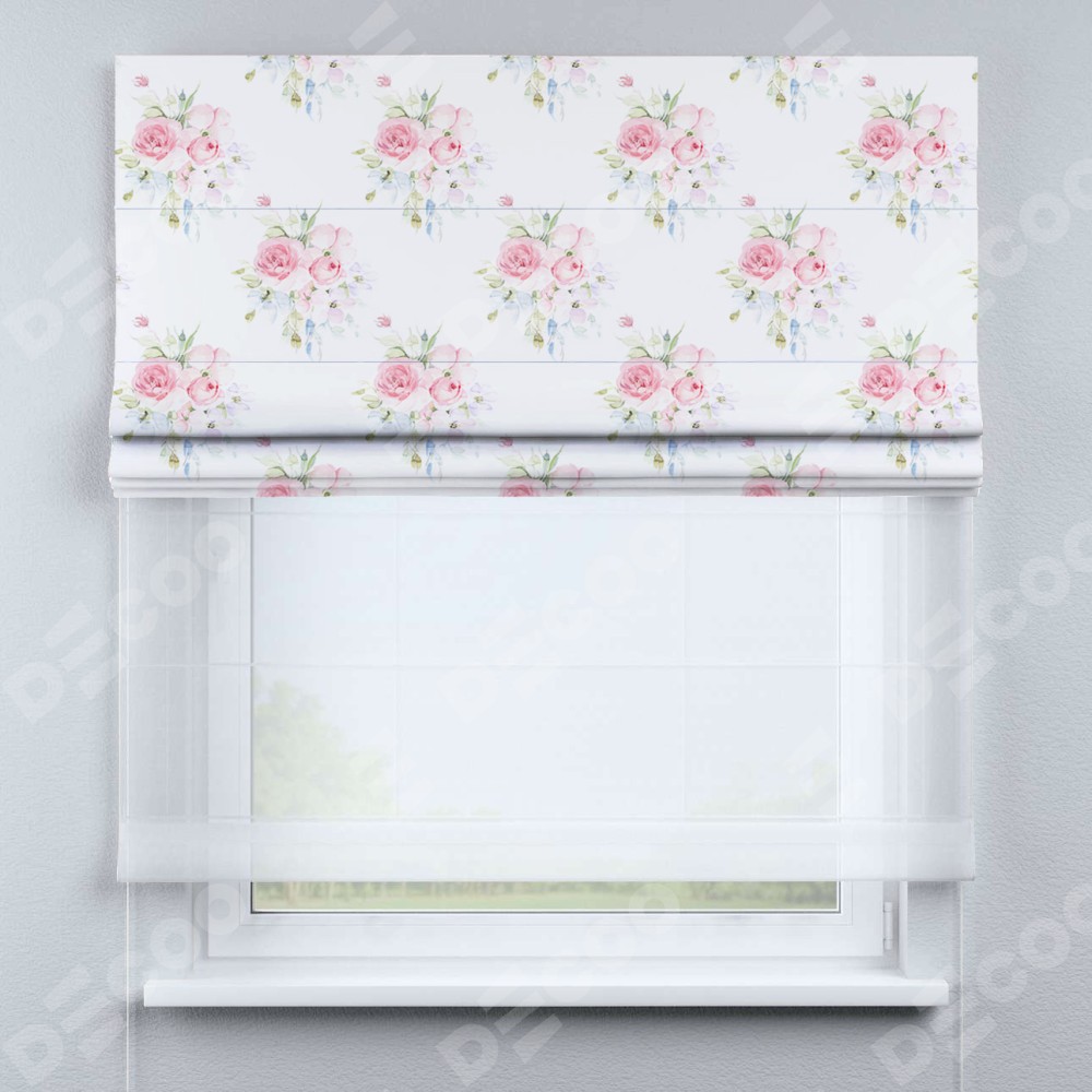Римская штора день-ночь производителя «Cortin», используется для проёма, пошита из двух полотен, с лицевой блэкаут с нанесением сублимационной печати «Нежный розарий», вторая ткань тюль (по стандарту комплектуется тюль белого цвета артикул V-01). Имеет универсальный механизм и подходит для монтажа: на потолок, на стену и в нишу.