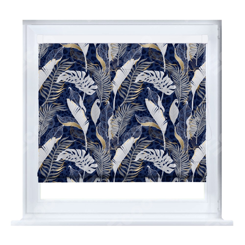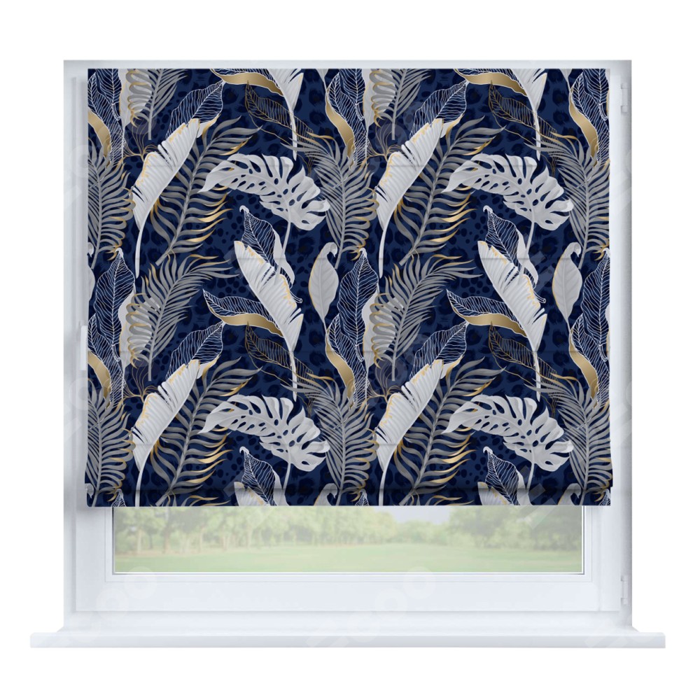 Римская штора производителя «Cortin», устанавливается на створку окна, пошита из ткани блэкаут с нанесением сублимационной печати «Сине-золотые джунгли». Штора шьётся по индивидуальным размерам, для данного типа римской шторы возможная ширина от 35 до 150 см., высота до 250 см.