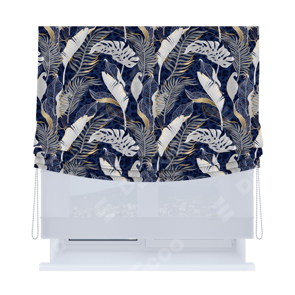 Римская штора «Кортин», день-ночь с мягкими складками, «Сине-золотые джунгли»