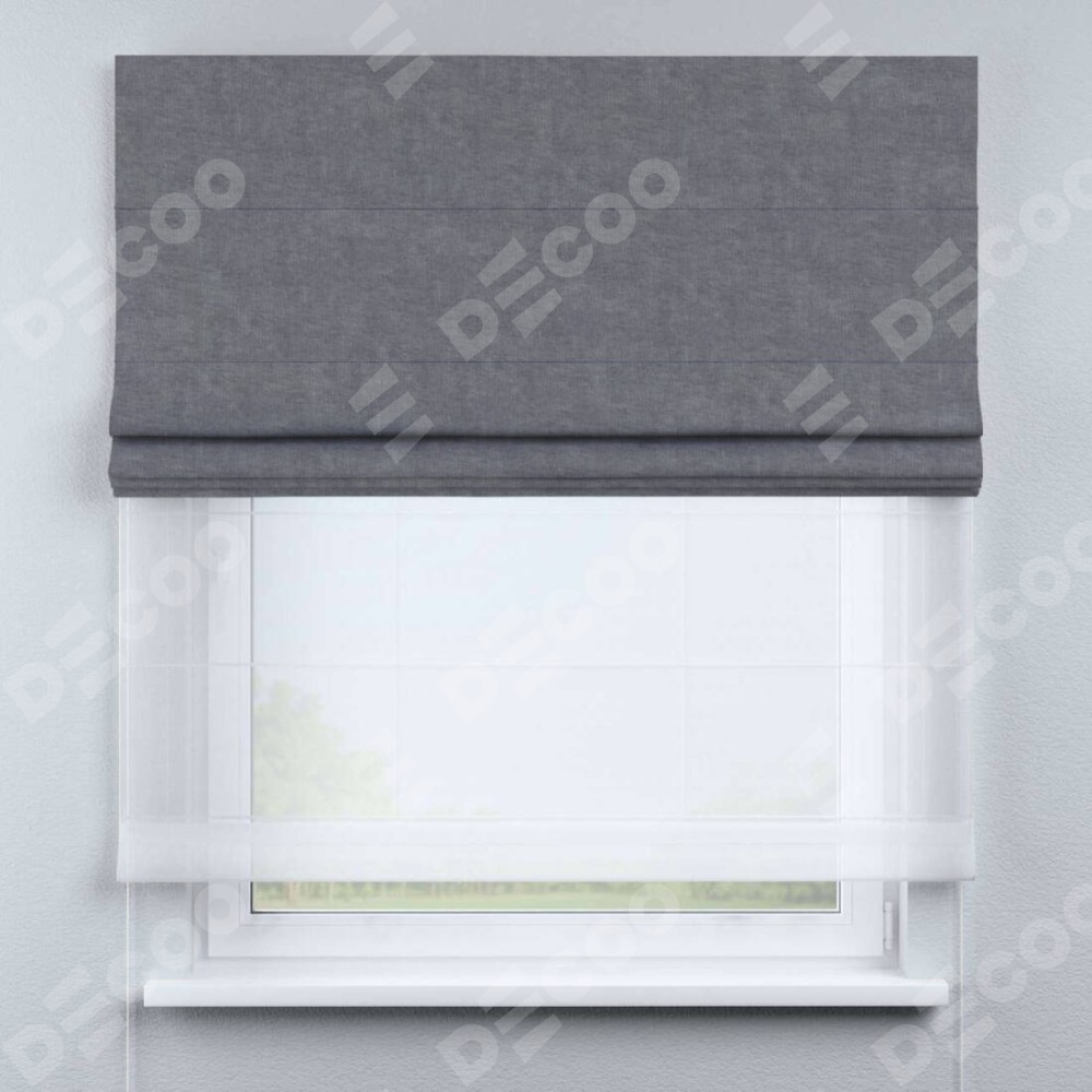 Римская штора день-ночь производителя «Cortin», используется для проёма, пошита из двух полотен, с лицевой стороны канвас стальной артикул v-1082, вторая ткань тюль (по стандарту комплектуется тюль белого цвета артикул V-01). Имеет универсальный механизм и подходит для монтажа: на потолок, на стену и в нишу.