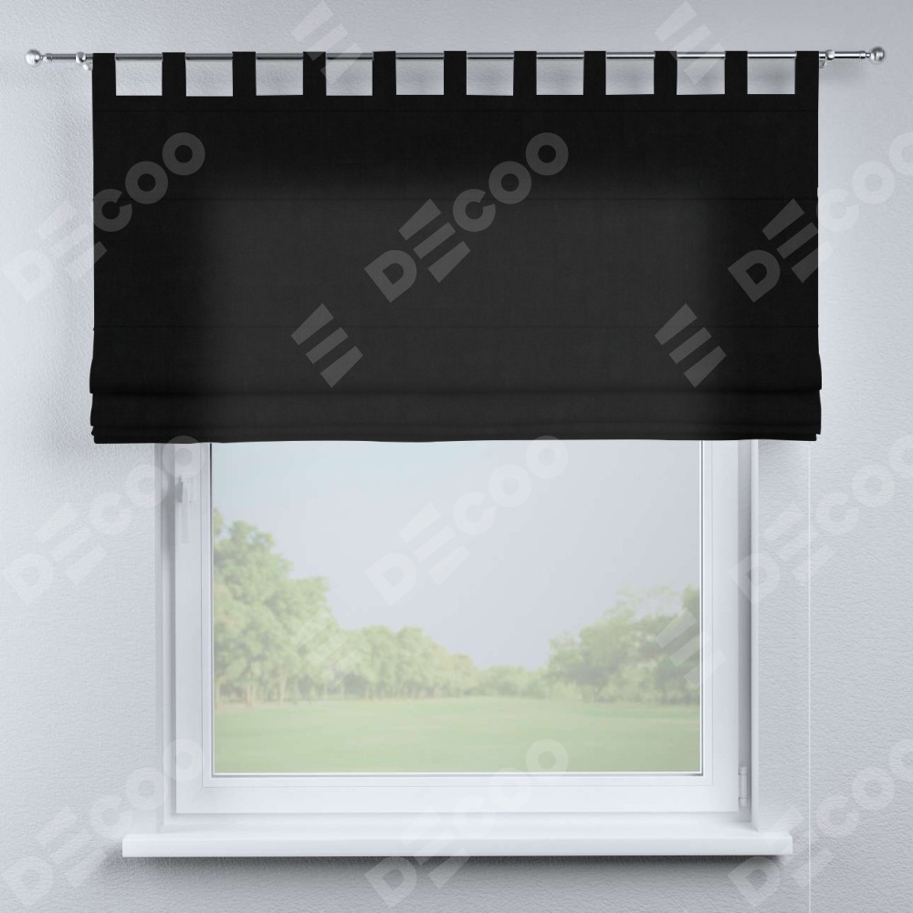 Римская штора производителя «Cortin», используется для проёма, пошита из ткани канвас черный, артикул ткани v-194. Данная модель пошита на петлях, комплектуется на выбор круглым карнизом и подходит для монтажа на стену. Римская штора на петлях имеет простую систему регулировки высоты, отличительным преимуществом данной модели является простой способ монтажа. Достаточно повесить ее на трубу и штора готова!