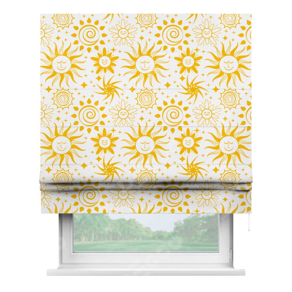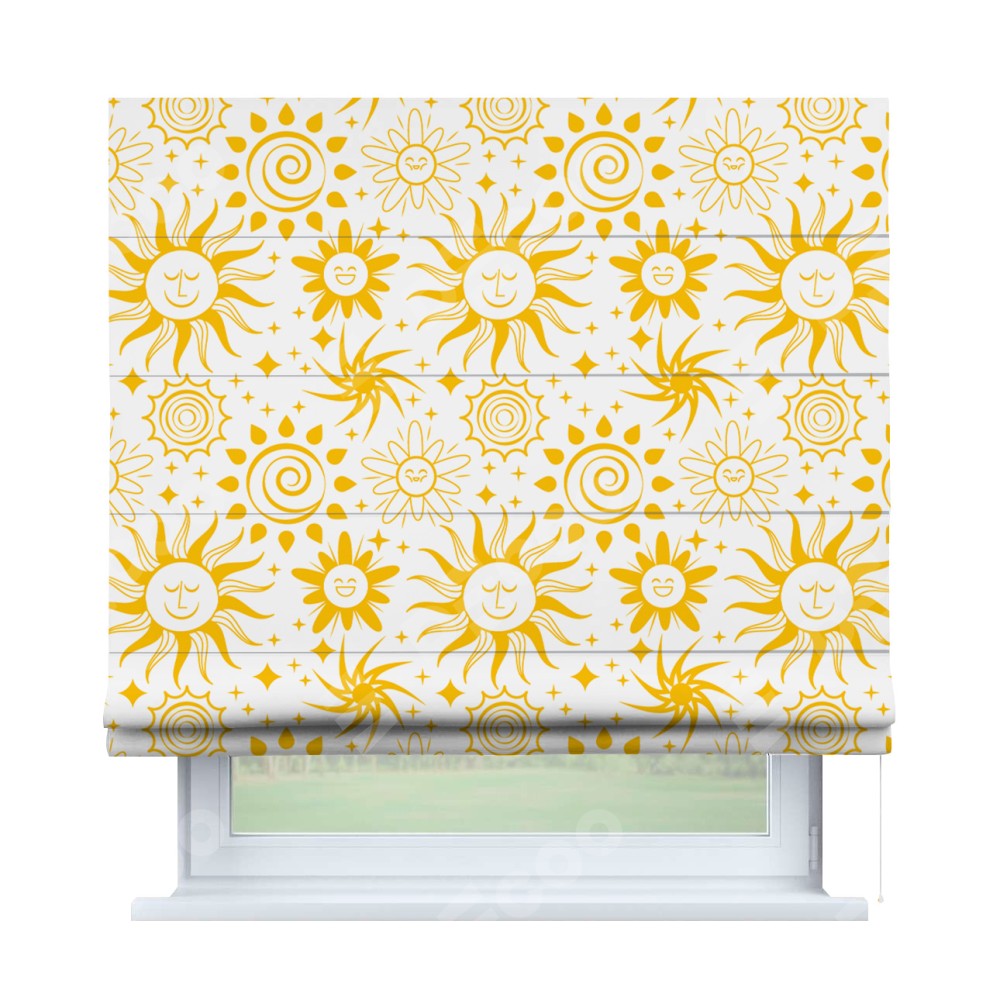 Римская штора производителя «Cortin», используется для проёма, пошита из ткани блэкаут с нанесением сублимационной печати «Солнышки». Имеет универсальный механизм и подходит для монтажа: на потолок, на стену и в нишу.