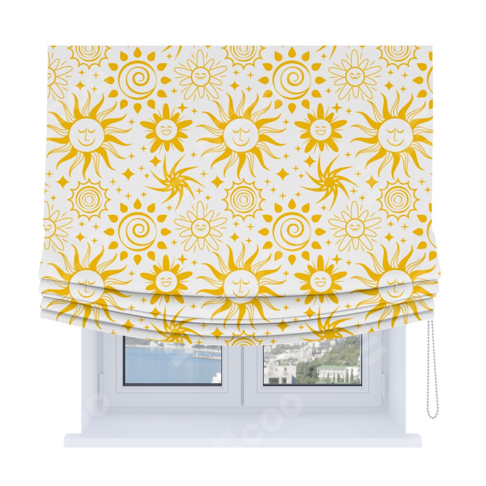 Римская штора Soft производителя «Cortin», используется для проёма, пошита из ткани блэкаут с нанесением сублимационной печати «Солнышки». Имеет универсальный механизм и подходит для монтажа: на потолок, на стену и в нишу. В отличие от стандартных римских штор, римская штора Soft не имеет горизонтальных вставок и нижнего отвеса. Это позволяет ткани произвольно драпироваться в свободные мягкие складки.