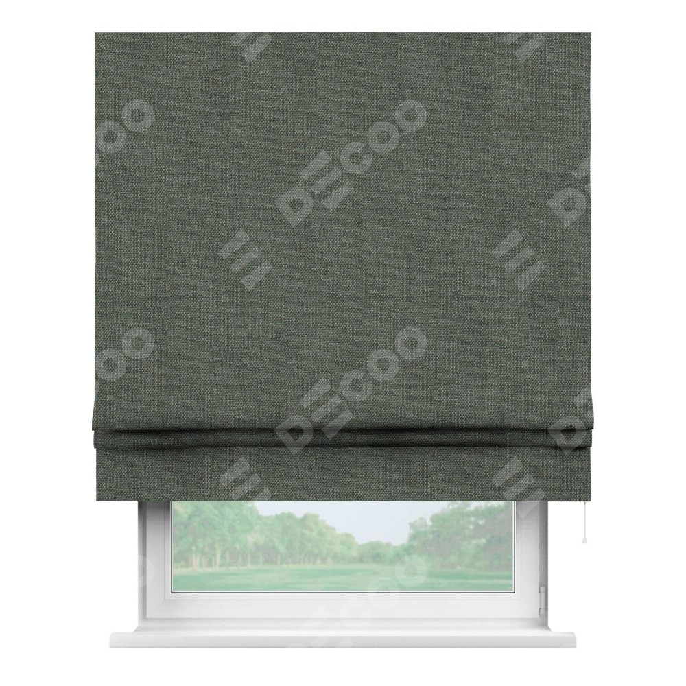 Римская штора производителя «Cortin», используется для проёма, пошита из ткани лён димаут тёмно-серый, артикул ткани 91011. Имеет универсальный механизм и подходит для монтажа: на потолок, на стену и в нишу.