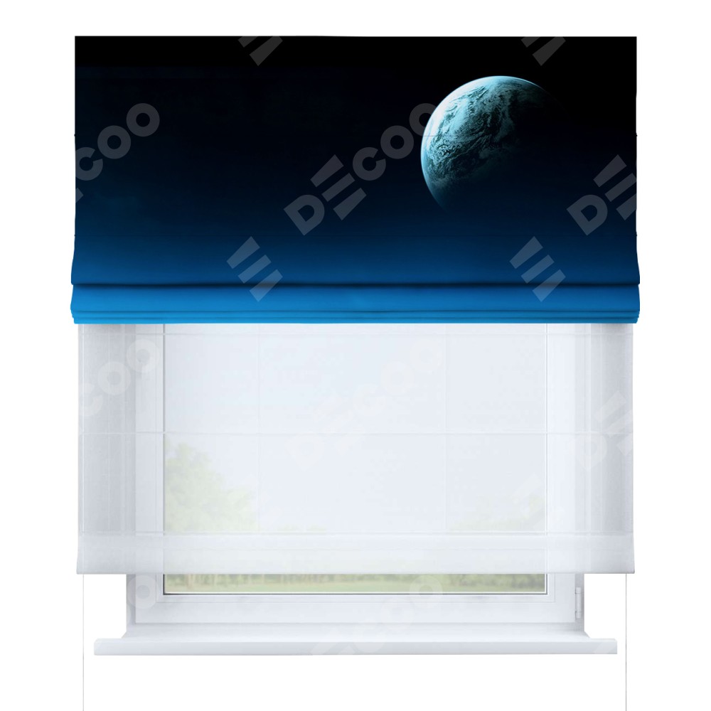 Римская штора день-ночь производителя «Cortin», используется для проёма, пошита из двух полотен, с лицевой блэкаут с нанесением сублимационной печати «Горизонты вселенной», вторая ткань тюль (по стандарту комплектуется тюль белого цвета артикул V-01). Имеет универсальный механизм и подходит для монтажа: на потолок, на стену и в нишу.