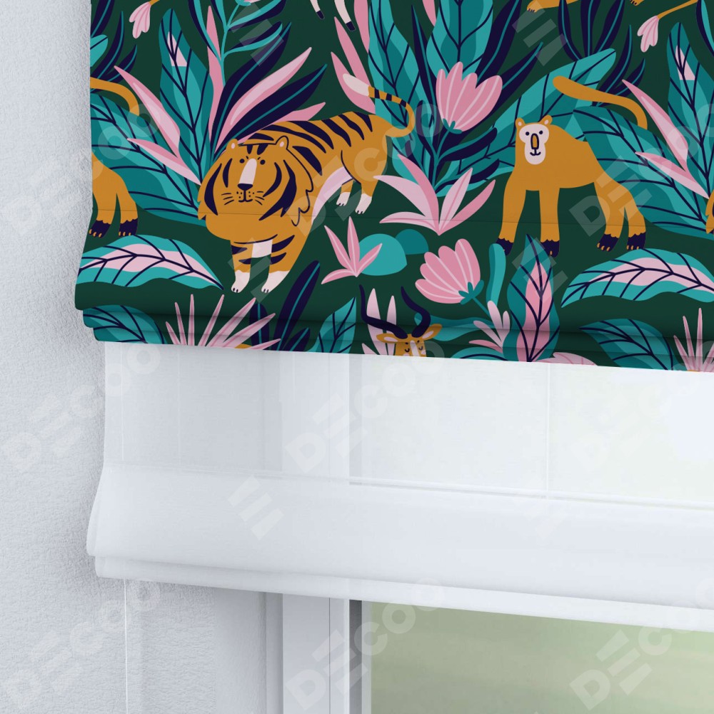 Римская штора день-ночь производителя «Cortin», используется для проёма, пошита из двух полотен, с лицевой блэкаут с нанесением сублимационной печати «Дикие животные», вторая ткань тюль (по стандарту комплектуется тюль белого цвета артикул V-01). Имеет универсальный механизм и подходит для монтажа: на потолок, на стену и в нишу.