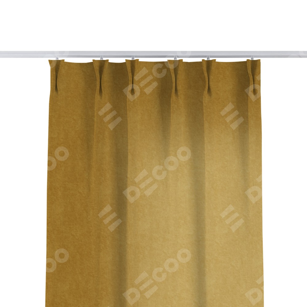 Комплект прямых штор, от производителя «Cortin», пошиты из ткани канвас горчица, артикул ткани v-476. С изнаночной стороны в верхней части штор пристрачивается шторная лента с декоративными складками «Кустик». Для создания элегантных складок прямые шторы шьются по стандарту с коэффициентом 1:2 (на 100 см. ширины проёма 200 см. ширины ткани).