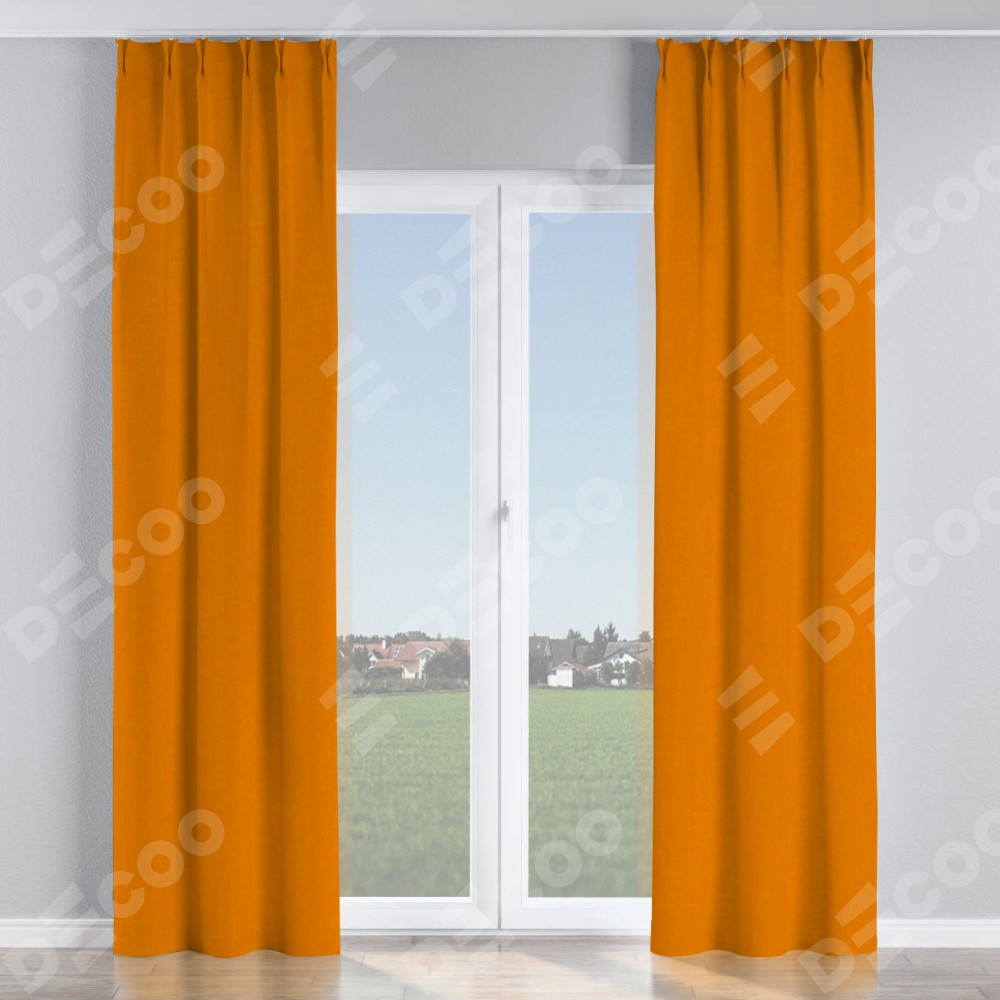 Комплект прямых штор, от производителя «Cortin», пошиты из ткани канвас оранжевый, артикул ткани v-106. С изнаночной стороны в верхней части штор пристрачивается шторная лента с декоративными складками «Кустик». Для создания элегантных складок прямые шторы шьются по стандарту с коэффициентом 1:2 (на 100 см. ширины проёма 200 см. ширины ткани).
