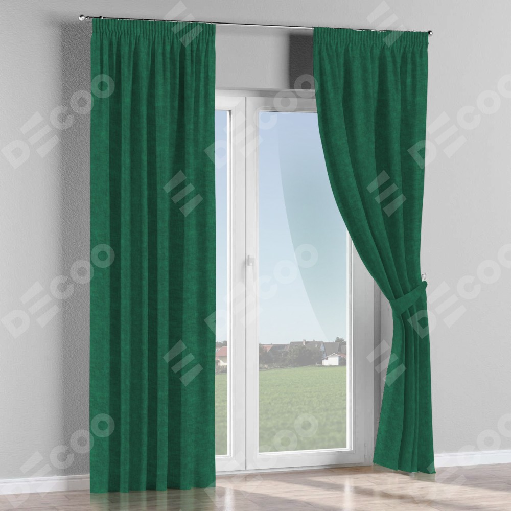 Комплект прямых штор, от производителя «Cortin», пошиты из ткани канвас тёмно-зелёный, артикул ткани v-469. С изнаночной стороны в верхней части штор пристрачивается шторная лента с декоративными складками «Карандаш». Для создания элегантных складок прямые шторы шьются по стандарту с коэффициентом 1:2 (на 100 см. ширины проёма 200 см. ширины ткани).