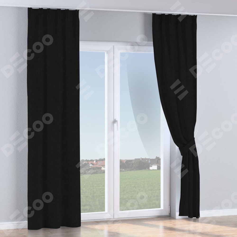 Комплект прямых штор, от производителя «Cortin», пошиты из ткани канвас черный, артикул ткани v-194. С изнаночной стороны в верхней части штор пристрачивается шторная лента с декоративными складками «Кустик». Для создания элегантных складок прямые шторы шьются по стандарту с коэффициентом 1:2 (на 100 см. ширины проёма 200 см. ширины ткани).