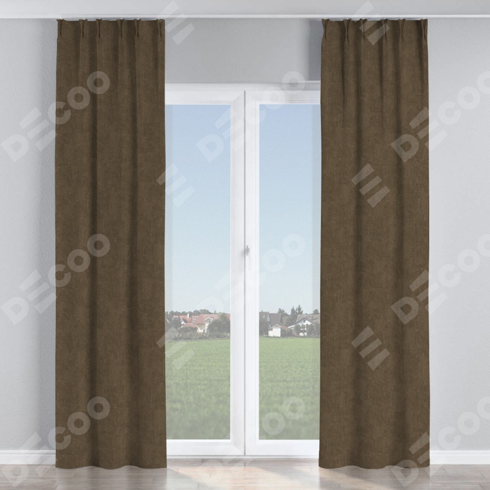 Комплект прямых штор, от производителя «Cortin», пошиты из ткани канвас шоколадный, артикул ткани v-193. С изнаночной стороны в верхней части штор пристрачивается шторная лента с декоративными складками «Кустик». Для создания элегантных складок прямые шторы шьются по стандарту с коэффициентом 1:2 (на 100 см. ширины проёма 200 см. ширины ткани).