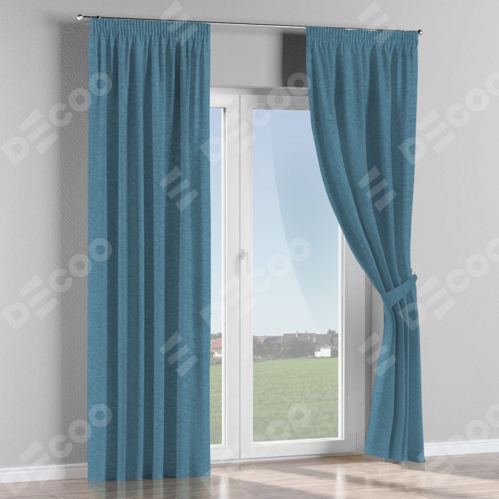 Комплект прямых штор, от производителя «Cortin», пошиты из ткани твид блэкаут светло-синий, артикул ткани 90935. С изнаночной стороны в верхней части штор пристрачивается шторная лента с декоративными складками «Карандаш». Для создания элегантных складок прямые шторы шьются по стандарту с коэффициентом 1:2 (на 100 см. ширины проёма 200 см. ширины ткани).