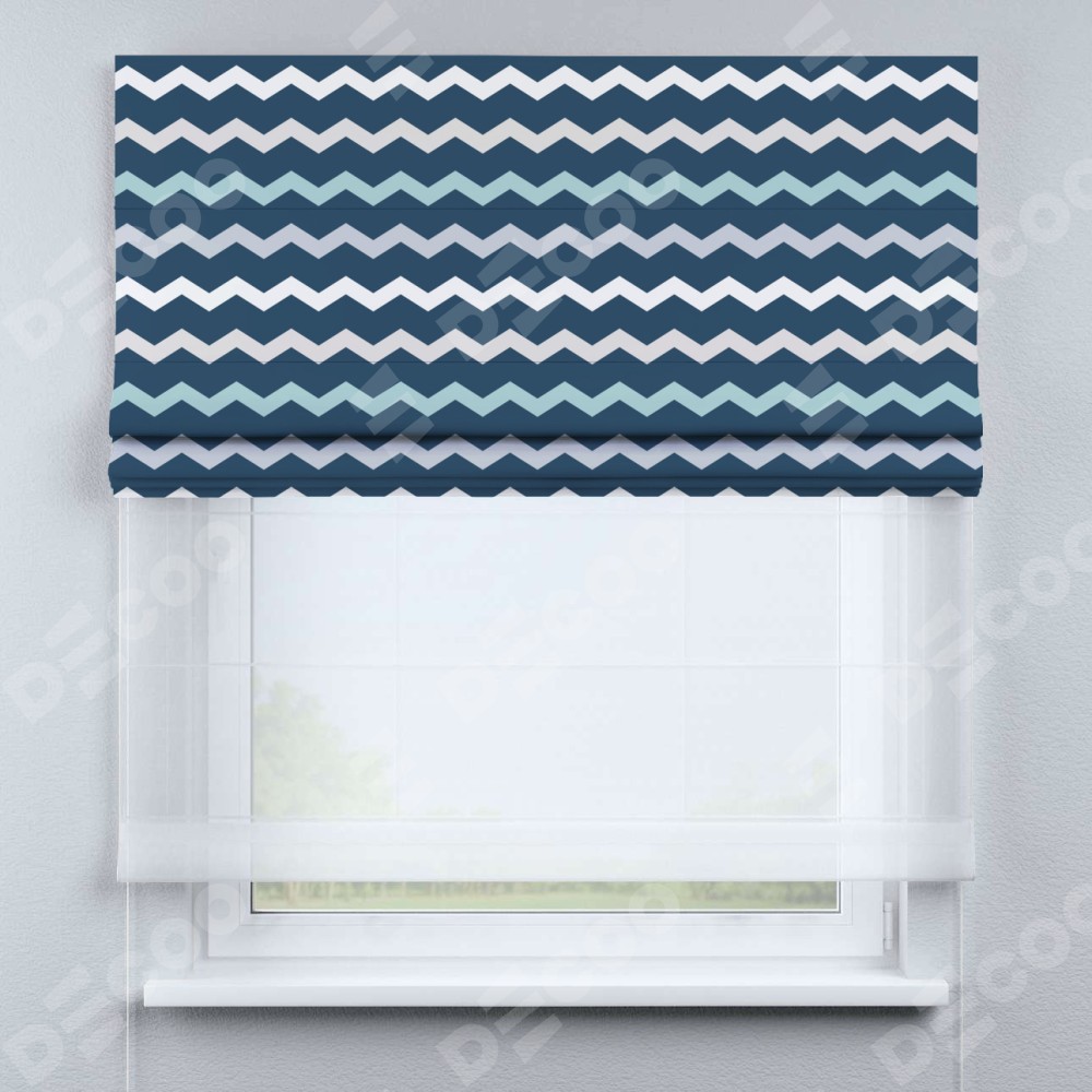 Римская штора день-ночь производителя «Cortin», используется для проёма, пошита из двух полотен, с лицевой блэкаут с нанесением сублимационной печати «Морской шеврон», вторая ткань тюль (по стандарту комплектуется тюль белого цвета артикул V-01). Имеет универсальный механизм и подходит для монтажа: на потолок, на стену и в нишу.