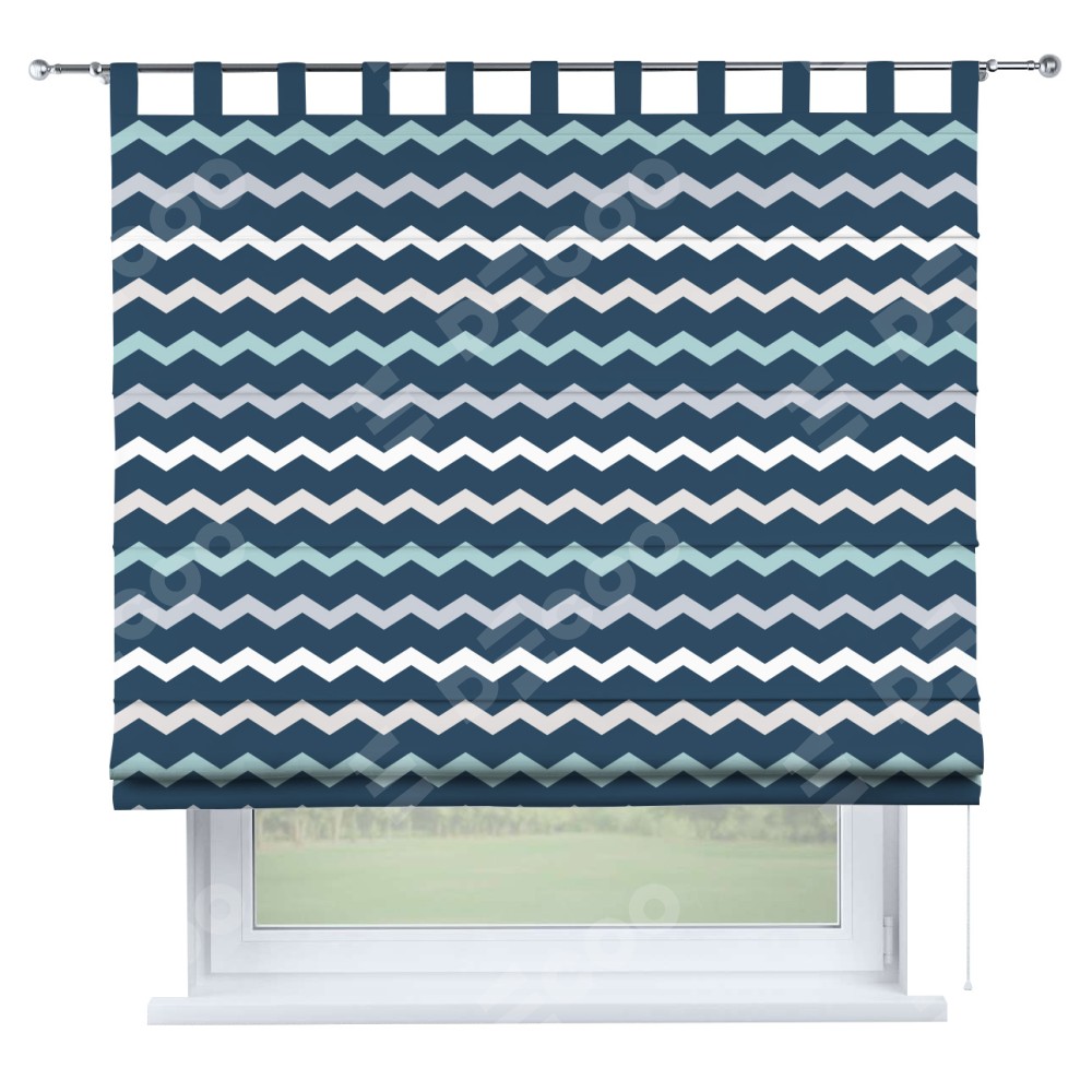 Римская штора производителя «Cortin», используется для проёма, пошита из ткани блэкаут с нанесением сублимационной печати «Морской шеврон». Данная модель пошита на петлях, комплектуется на выбор круглым карнизом и подходит для монтажа на стену. Римская штора на петлях имеет простую систему регулировки высоты, отличительным преимуществом данной модели является простой способ монтажа. Достаточно повесить ее на трубу и штора готова!